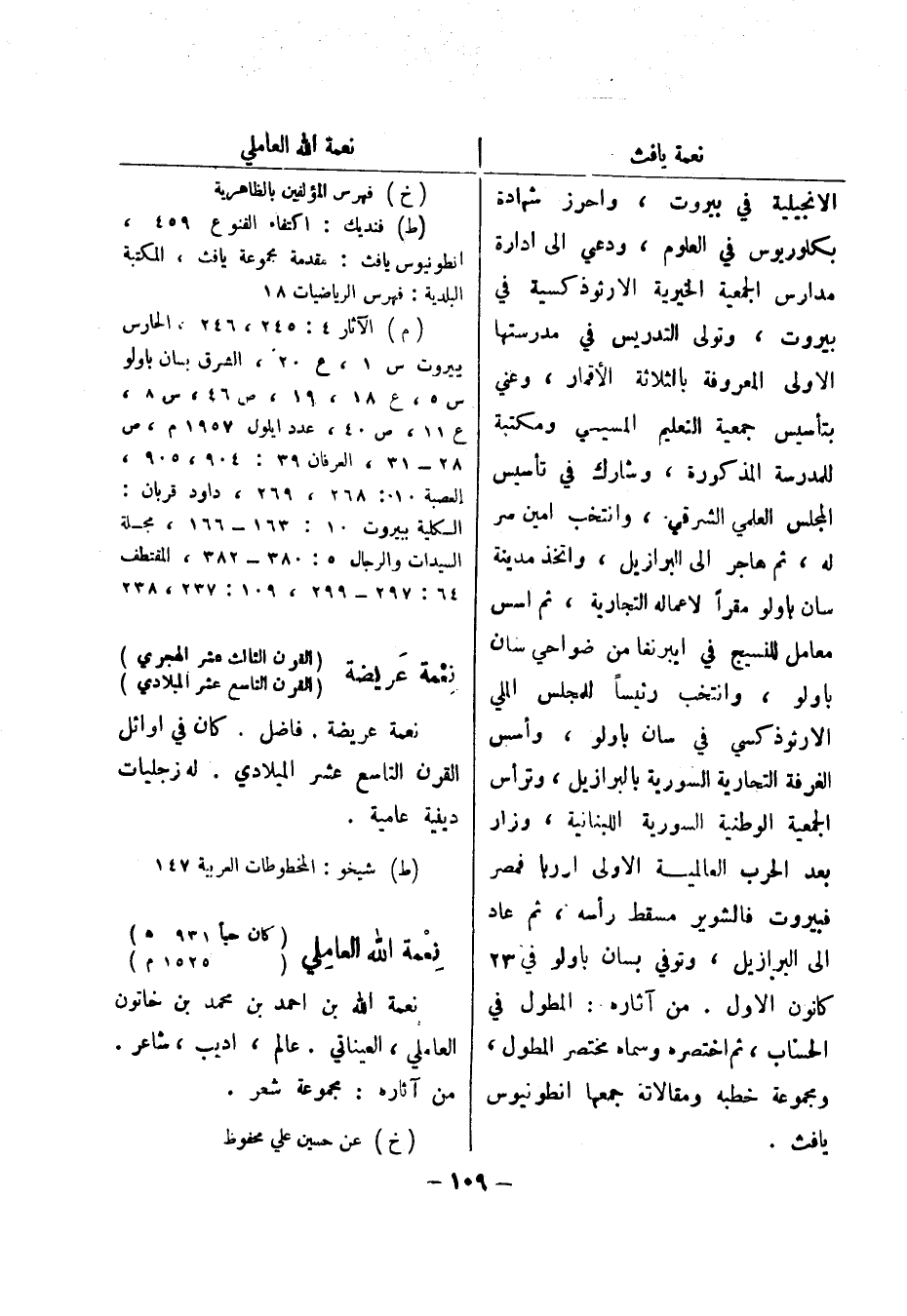 (خ) فهرس المؤلفين بالظاهرية (ط) فنديك: اكتفاء القنوع 459، انطونيوس يافث: مقدمة مجموعة يافث، المكتبة البلدية: فهرس الرياضيات 18 (م) الآثار 4: 245، 246، الحارس ببيروت س 1، ع 20، الشرق بسان باولو س 5، ع 18، 19، ص 46، س 8، ع 11، ص 40، عدد ايلول 1957 م، ص 28 - 31، العرفان 39: 904، 905، العصبة 10: 268، 269، داود قربان: الكلية ببيروت 10: 163 - 166، مجلة السيدات والرجال 5: 380 - 382، المقتطف 64: 297 - 299، 109: 237، 238 نعمة عريضة (القرن الثالث عشر الهجري) (القرن التاسع عشر الميلادي) نعمة عريضة.
