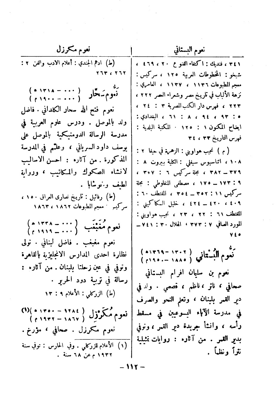 (ط) الزركلي: الاعلام 9: 13 نعوم مكرزل (1284 - 1350 هـ) (1) (1867 - 1932 م) نعوم مكرزل.