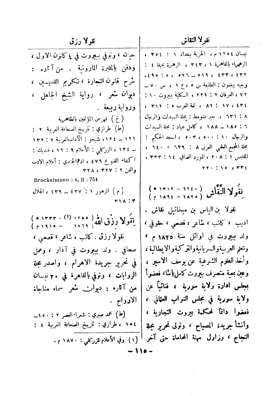 (خ) فهرس المؤلفين بالظاهرية (ط) طرازي: تاريخ الصحافة العربية 2: 121 - 124، شيخو: الآداب العربية 2: 132 134، الزركلي: الاعلام 9: 19، فنديك: اكتفاء القنوع 479، ادهم الجندي: أعلام الادب والفن 2: 327، 328 754: Brockelmann: s , II (م) الزهور 1: 437 - 439، الهلال 3: 318 نقولا رزق الله (1285 (1) - 1333 هـ) (1869 - 1915 م) نقولا رزق.