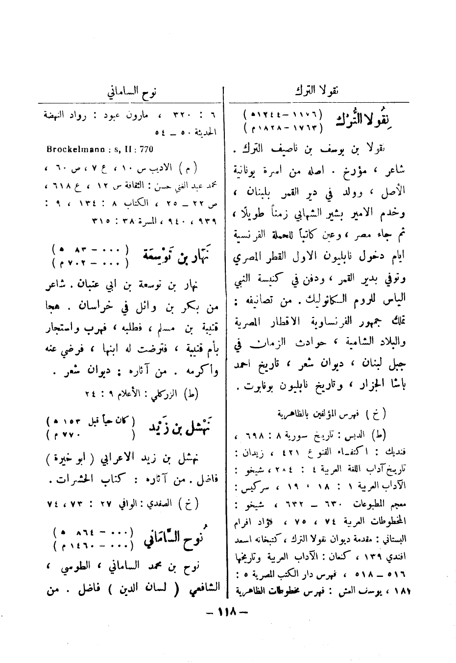 (خ) فهرس المؤلفين بالظاهرية (ط) الدبس: تاريخ سورية 8: 698، فنديك: اكتفاء القنوع 421، زيدان: تاريخ آداب اللغة العربية 4: 284، شيخو: الآداب العربية 1: 18، 19، سركيس: معجم المطبوعات 630 - 632، شيخو: المخطوطات العربية 74، 75، فؤاد افرام البستاني: مقدمة ديوان نقولا الترك، كتبخانه اسعد افندي 139، كنعان: الآداب العربية وتاريخها 516 - 518، فهرس دار الكتب المصرية 5: 187، يوسف العش: فهرس مخطوطات الظاهرية 6: 320، مارون عبود: رواد النهضة الحديثة 50 - 54 770: Brockelmann: s , II
