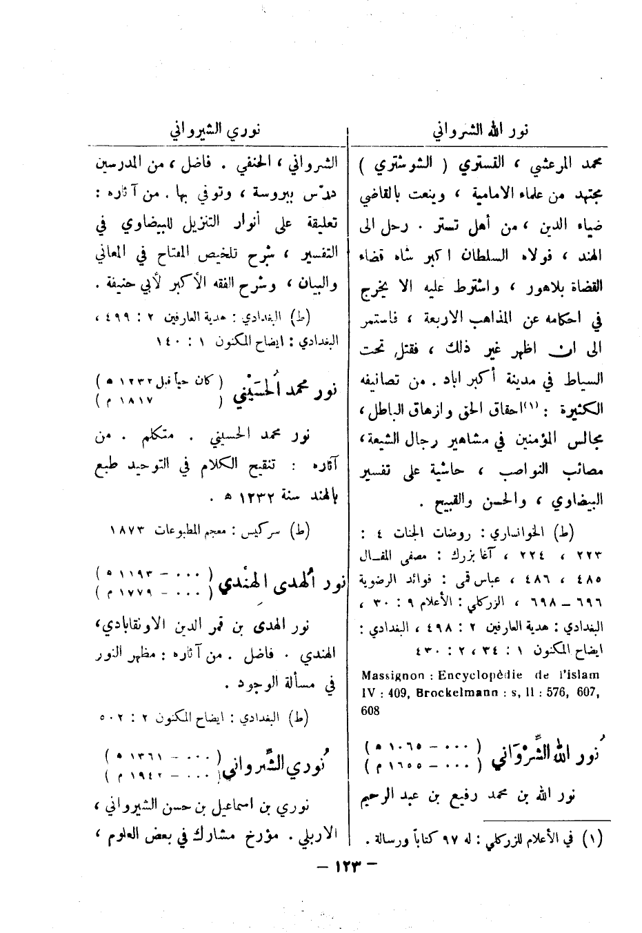 (ط) سركيس: معجم المطبوعات 1873 نور الهدى الهندي (000 - 1193 هـ) (000 - 1779 م) نور الهدى بن قمر الدين الاونقابادي، الهندي.