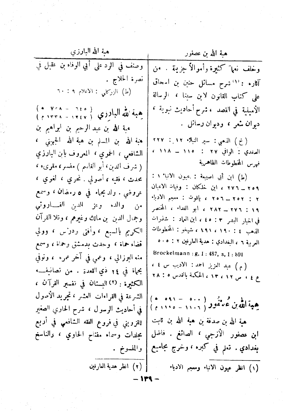 (ط) الزركلي: الاعلام 9: 60 هبة الله البارزي (645 - 728 هـ) (1247 - 1338 م) هبة الله بن عبد الرحيم بن ابراهيم بن هبة الله بن المسلم بن هبة الله الجهيني، الشافعي، الحموي، المعروف بابن البارزي (شرف الدين، أبو القاسم) مفسر، مقرئ، محدث، فقيه، أصولي.