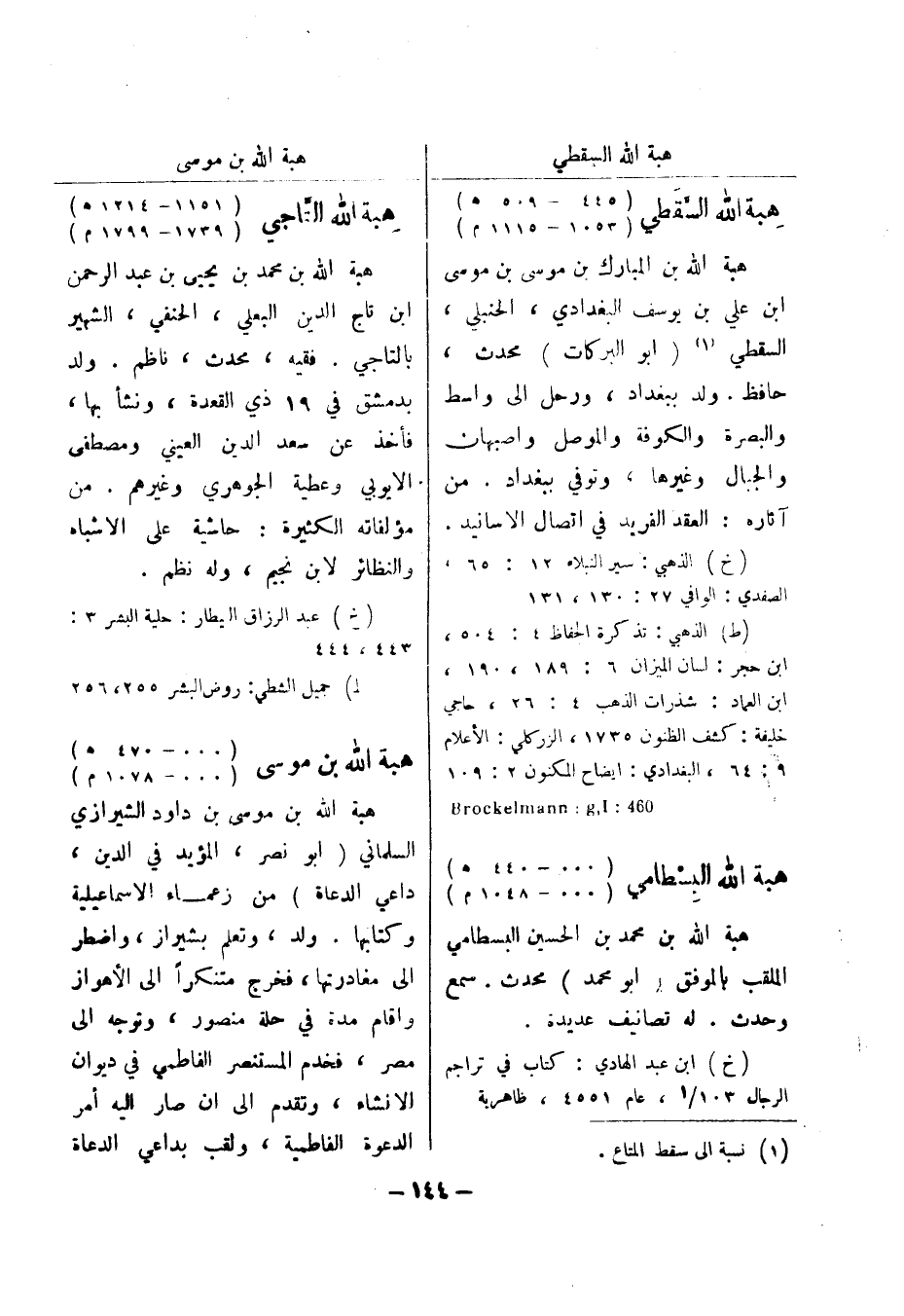 (خ) عبد الرزاق البيطار: حلية البشر 3: 443، 444 (ط) جميل الشطي: روض البشر 255، 256 هبة الله بن موسى (000 - 470 هـ) (000 - 1078 م) هبة الله بن موسى بن داود الشيرازي السلماني (أبو نصر، المؤيد في الدين، داعي الدعاة) من زعماء الاسماعيلية