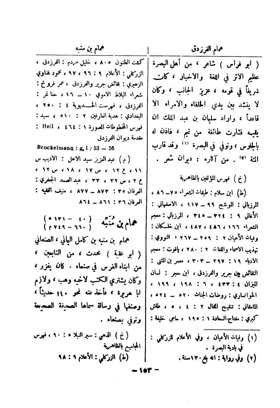 الفرزدق، فهرست الخديوية 4: 250، البغدادي: هدية العارفين 2: 510، سيد: فهرس المخطوطات المصورة 1: 464،: Hell مقدمة ديوان الفرزدق 56 - 53: Brockelmann: g , I (م) عبد العزيز سيد الاهل: الاديب س 11، ع 12، ص 17، 18، س 12، ع 2، ص 32، 33، عبد الصمد الجعفري: العرفان 35: 873 - 877، منيف الفقيه: العرفان 36: 861 - 864 همام بن منبه (40 - 131 هـ) (660 - 749 م) همام بن منبه بن كامل اليماني، الصنعاني (أبو عقبة) محدث، من التابعين، من ابناء الفرس في صنعاء.