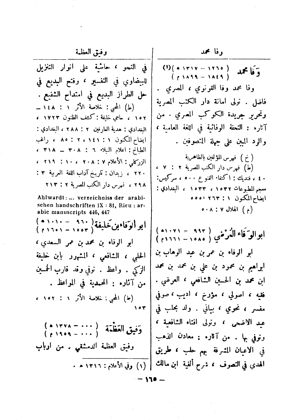 (خ) فهرس المؤلفين بالظاهرية (ط) فهرس دار الكتب المصرية 2: 7، 40، فنديك: اكتفاء القنوع 500، سركيس: معجم المطبوعات 1532، 1533، البغدادي: ايضاح المكنون 1: 263، 555 (م) الهلال 7: 508 ابو الوفاء العرضي (993 - 1071 هـ) (1585 - 1661 م) ابو الوفاء بن عمر بن عبد الوهاب بن