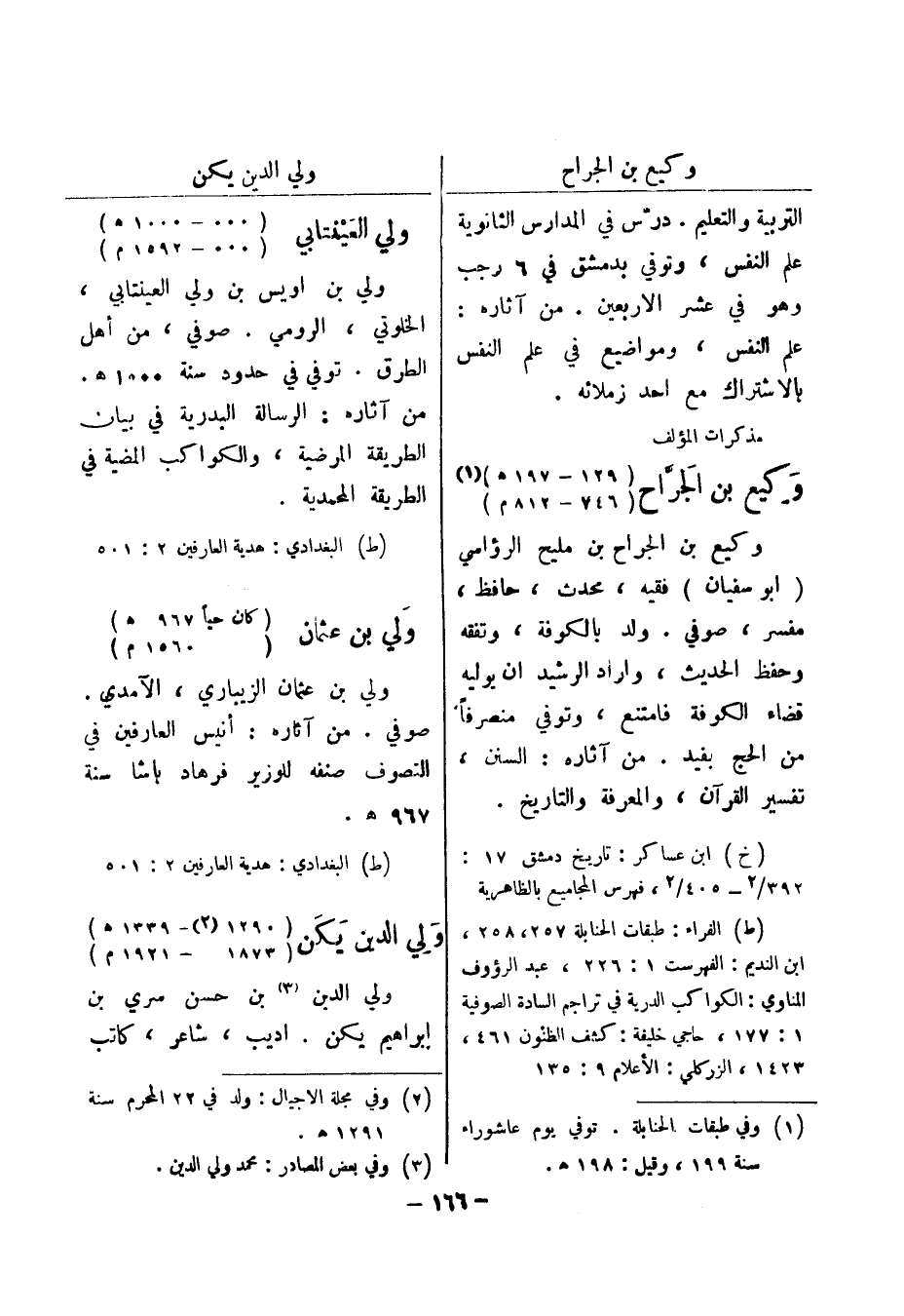 (ط) البغدادي: هدية العارفين 2: 501 ولي الدين يكن (1290 (2) - 1339 هـ) (1873 - 1921 م) ولي الدين (3) بن حسن سري بن ابراهيم يكن.