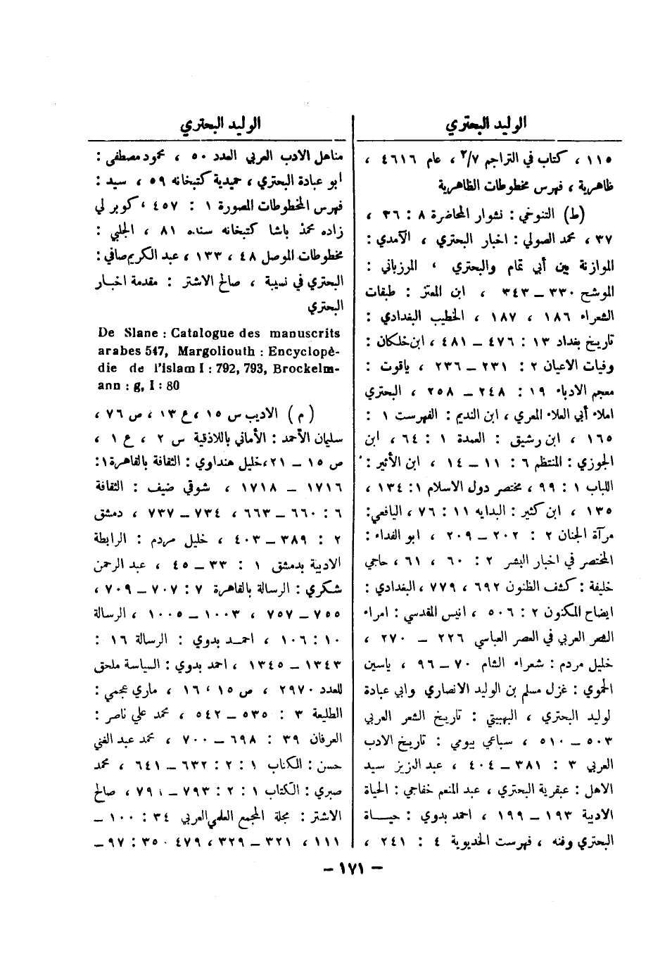 37، محمد الصولي: اخبار البحتري، الآمدي: الموازنة بين أبي تمام والبحتري، المرزباني: الموشح 330 - 343، ابن المعتز: طبقات الشعراء 186، 187، الخطيب البغدادي: تاريخ بغداد 13: 476 - 481، ابن خلكان: وفيات الاعيان 2: 231 - 236، ياقوت: معجم الادباء 19: 248 - 258، البحتري املاء أبي العلاء المعري، ابن النديم: الفهرست 1: 165، ابن رشيق: العمدة 1: 64، ابن الجوزي: المنتظم 6: 11 - 14، ابن الاثير: اللباب 1: 99، مختصر دول الاسلام 1: 134، 135، ابن كثير: البدايه 11: 76، اليافعي: مرآة الجنان 2: 202 - 209، أبو الفداء: المختصر في اخبار البشر 2: 60، 61، حاجي خليفة: كشف الظنون 692، 779، البغدادي: ايضاح المكنون 2: 506، انيس المقدسي: امراء الشعر العربي في العصر العباسي 226 - 270، خليل مردم: شعراء الشام 70 - 96، ياسين الحموي: غزل مسلم بن الوليد الانصاري وابي عبادة لوليد البحتري، البهبيتي: تاريخ الشعر العربي 503 - 510، سباعي بيومي: تاريخ الادب العربي 3: 381 - 404، عبد العزيز سيد