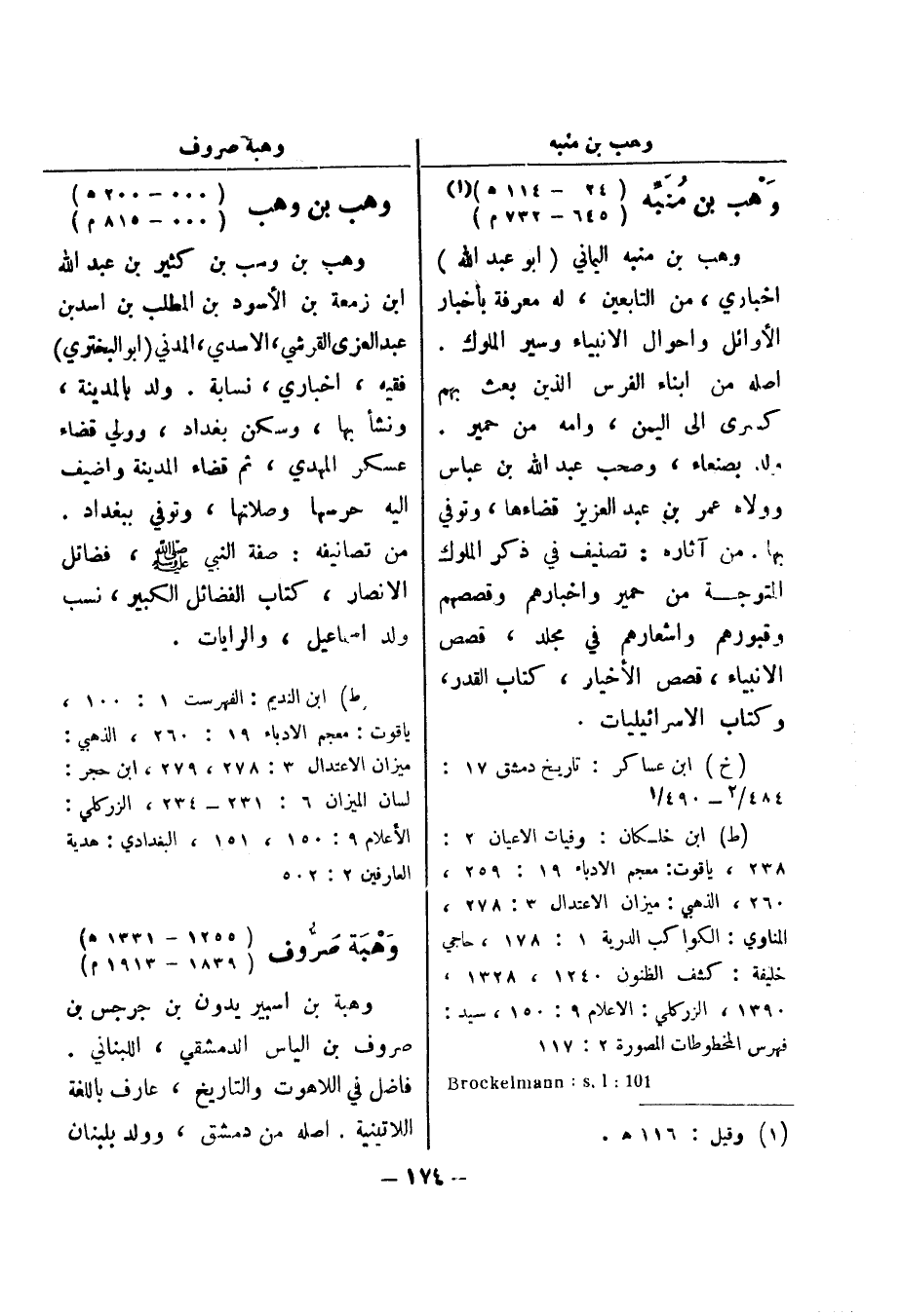 (ط) ابن النديم: الفهرست 1: 100، ياقوت: معجم الادباء 19: 260، الذهبي: ميزان الاعتدال 3: 278، 279، ابن حجر: لسان الميزان 6: 231 - 234، الزركلي: الاعلام 9: 150، 151، البغدادي: هدية العارفين 2: 502 وهبة صروف (1255 - 1331 هـ) (1839 - 1913 م) وهبة بن اسبير يدون بن جرجس بن صروف بن الياس الدمشقي، اللبناني.