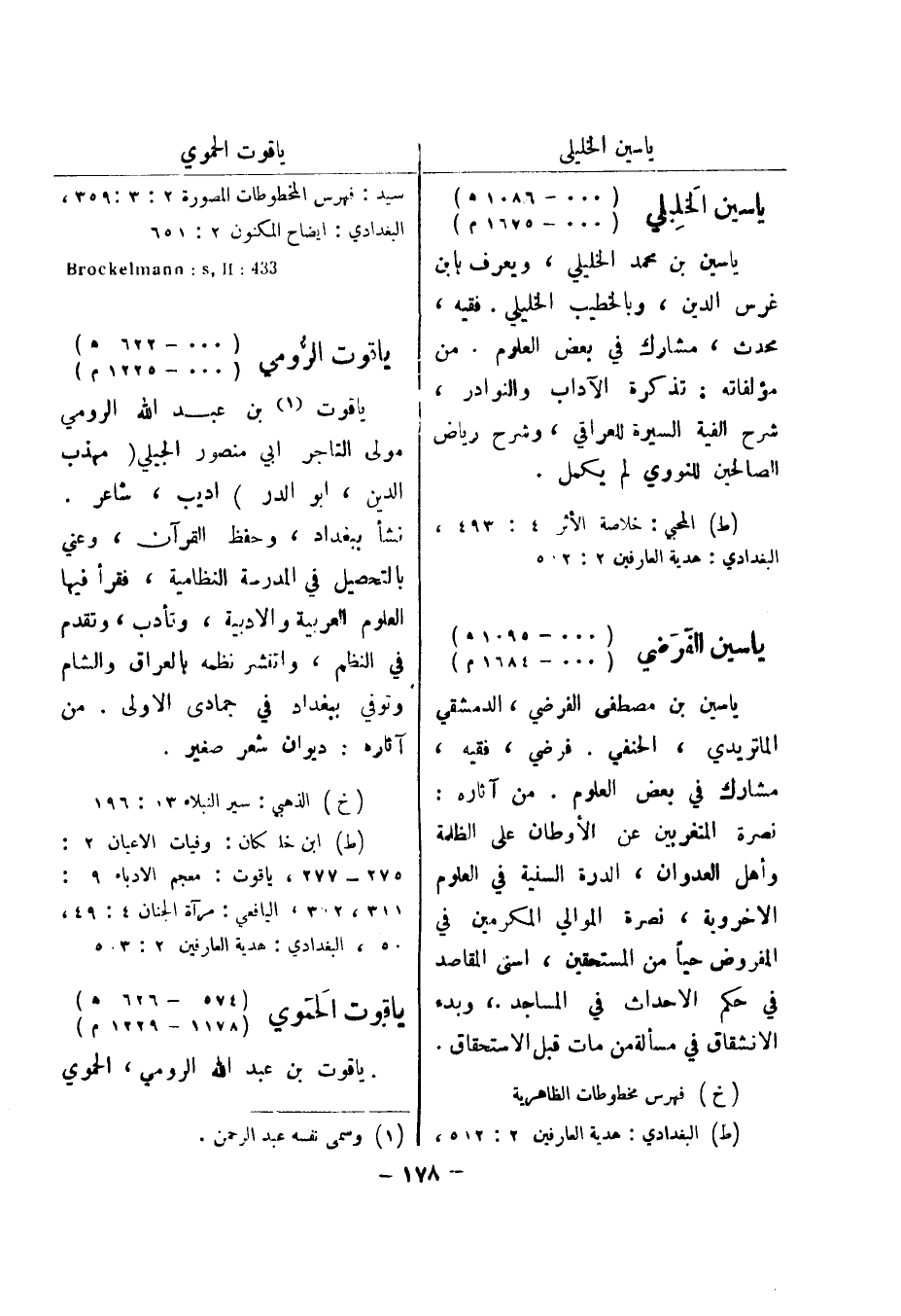 (ط) المحبي: خلاصة الاثر 4: 493، البغدادي: هدية العارفين 2: 502 ياسين الفرضي (000 - 1095 هـ) (000 - 1684 م) ياسين بن مصطفى الفرضي، الدمشقي الماتريدي، الحنفي.