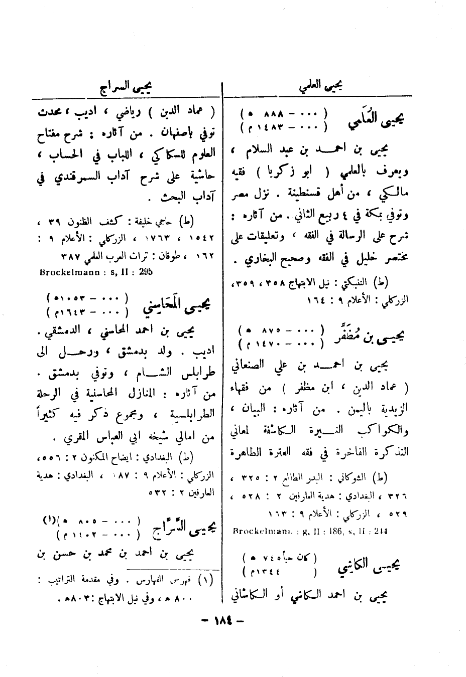 (ط) حاجي خليفة: كشف الظنون 39، 1542، 1763، الزركلي: الاعلام 9: 162، طوقان: تراث العرب العلمي 387 295: Brockelmann: s , II يحيى المحاسني (000 - 1053 هـ) (000 - 1643 م) يحيى بن احمد المحاسني، الدمشقي.