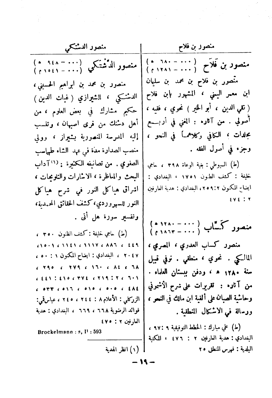 (ط) السيوطي: بغية الوعاة 398، حاجي خليفة: كشف الظنون 1751، البغدادي: ايضاح المكنون 2: 259، البغدادي: هدية العارفين 2: 474 منصور كساب (000 - 1280 هـ) (000 - 1863 م) منصور كساب العدوي، المصري، المالكي.