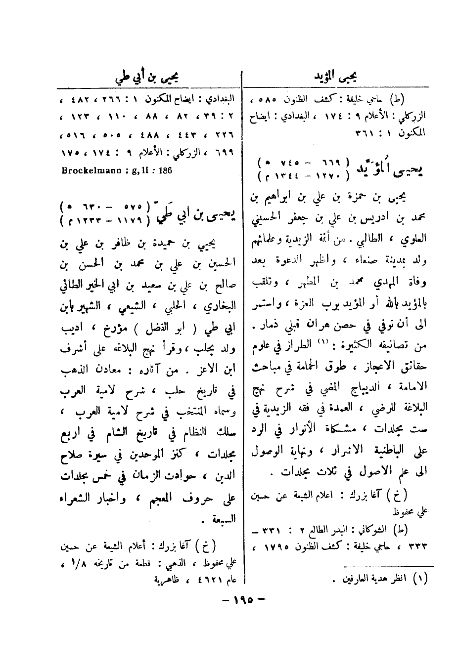 (ط) حاجي خليفة: كشف الظنون 585، الزركلي: الاعلام 9: 174، البغدادي: ايضاح المكنون 1: 361 يحيى المؤيد (669 - 745 هـ) (1270 - 1344 م) يحيى بن حمزة بن علي بن ابراهيم بن محمد بن ادريس بن علي بن جعفر الحسيني