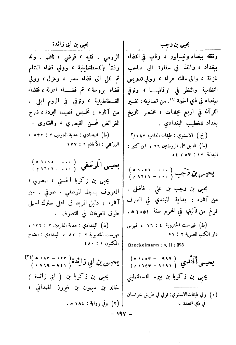 المكنون 1: 480 يحيى بن ابي زائدة (123 - 183 هـ) (2) (741 - 799 م) يحيى بن زكريا بن (ابي زائدة) خالد بن ميمون بن فيروز الهمداني،