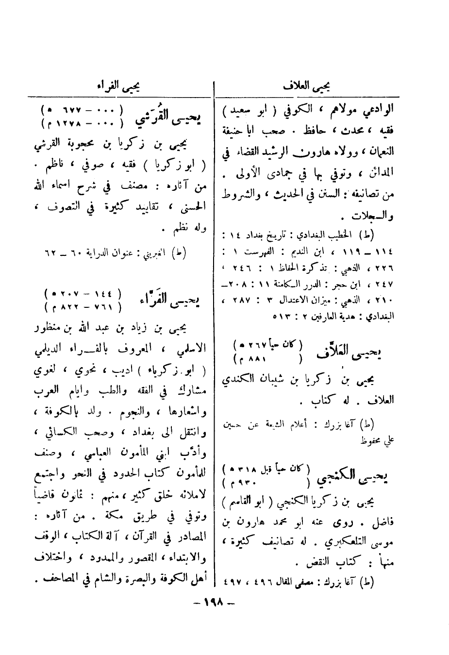 (ط) الغبريني: عنوان الدراية 60 - 62 يحيى الفراء (144 - 207 هـ) (761 - 822 م) يحيى بن زياد بن عبد الله بن منظور الاسلمي، المعروف بالفراء الديلمي (ابوزكرياء) اديب، نحوي، لغوي