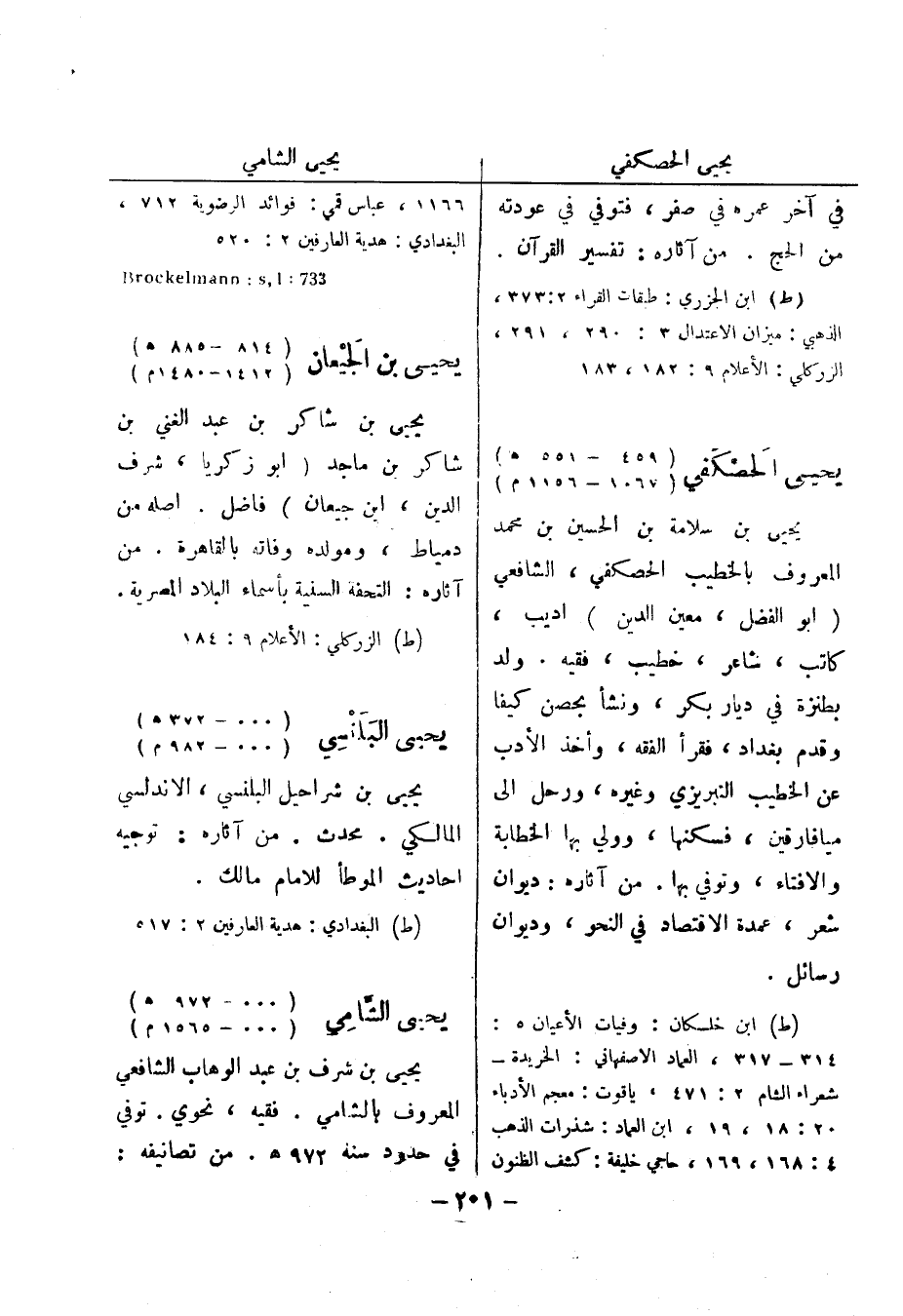 (ط) البغدادي: هدية العارفين 2: 517 يحيى الشامي (000 - 972 هـ) (000 - 1565 م) يحيى بن شرف بن عبد الوهاب الشافعي