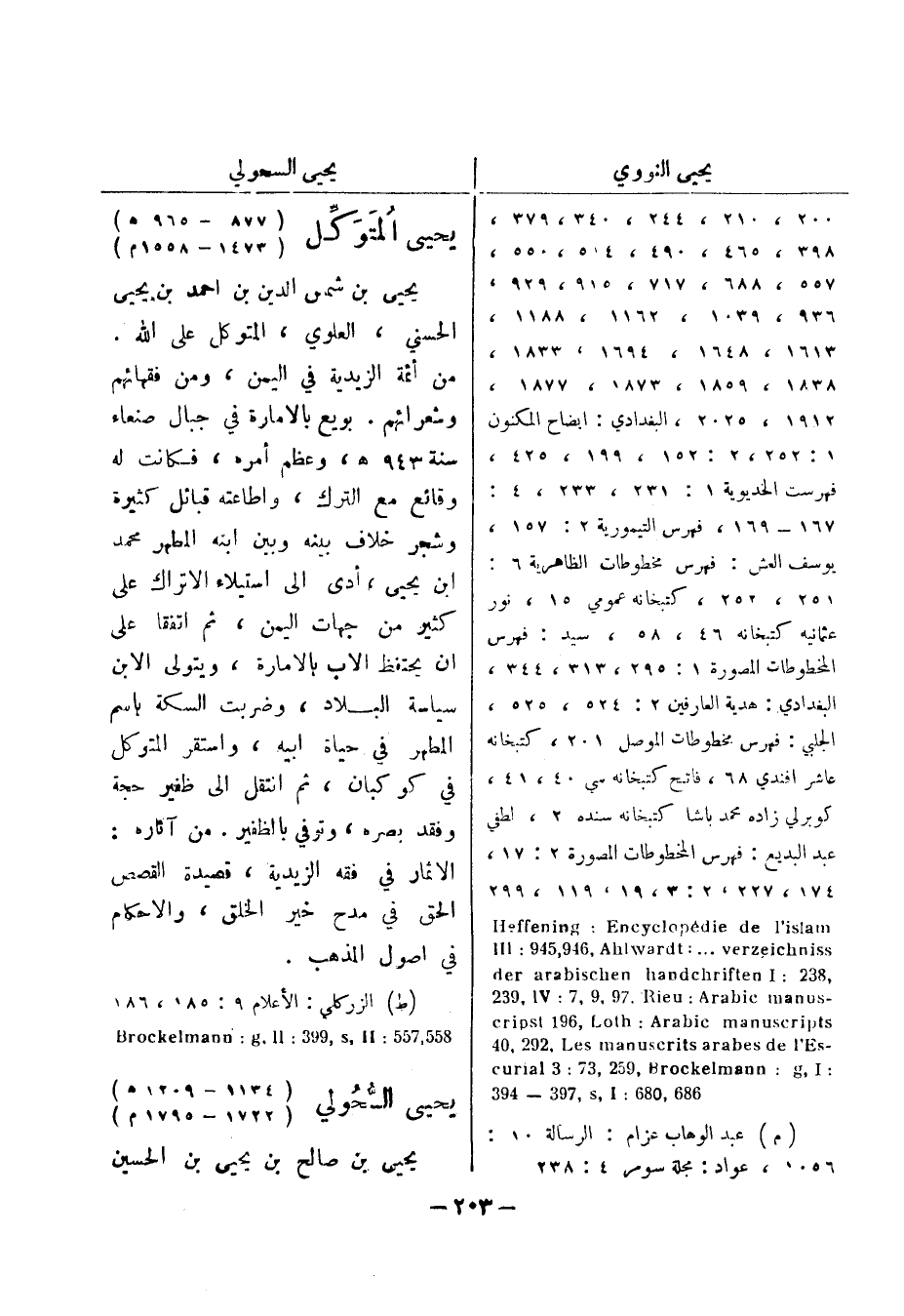 المخطوطات المصورة 1: 295، 313، 344، البغدادي: هدية العارفين 2: 524، 525، الجلبي: فهرس مخطوطات الموصل 201، كتبخانه عاشر افندي 68، فاتح كتبخانه سي 40، 41، كوبرلي زاده محمد باشا كتبخانه سنده 2، لطفي عبد البديع: فهرس المخطوطات المصورة 2: 17، 174، 227، 2: 3، 19، 119، 299، Heffening: Encyclopedie de i islam III: 549 , Ahlward 649: verzeichniss , 238: der arabischen handchriften I - 932 , IV: 7 , 9 , 79 , Rieu: Arabic manus cripst 691 , Loth: Arabic manuseripts - 04 , 292 , Les manuserits arabes de I Es: curial 3: 37 , 952 , brockelmann: G , I 686 , 680: 493 - 793 , s , I (م) عبد الوهاب عزام: الرسالة 10: 1056، عواد: مجلة سومر 4: 238 يحيى المتوكل (877 - 965 هـ) (1473 - 1558 م) يحيى بن شمس الدين بن احمد بن يحيى الحسني، العلوي، المتوكل على الله.