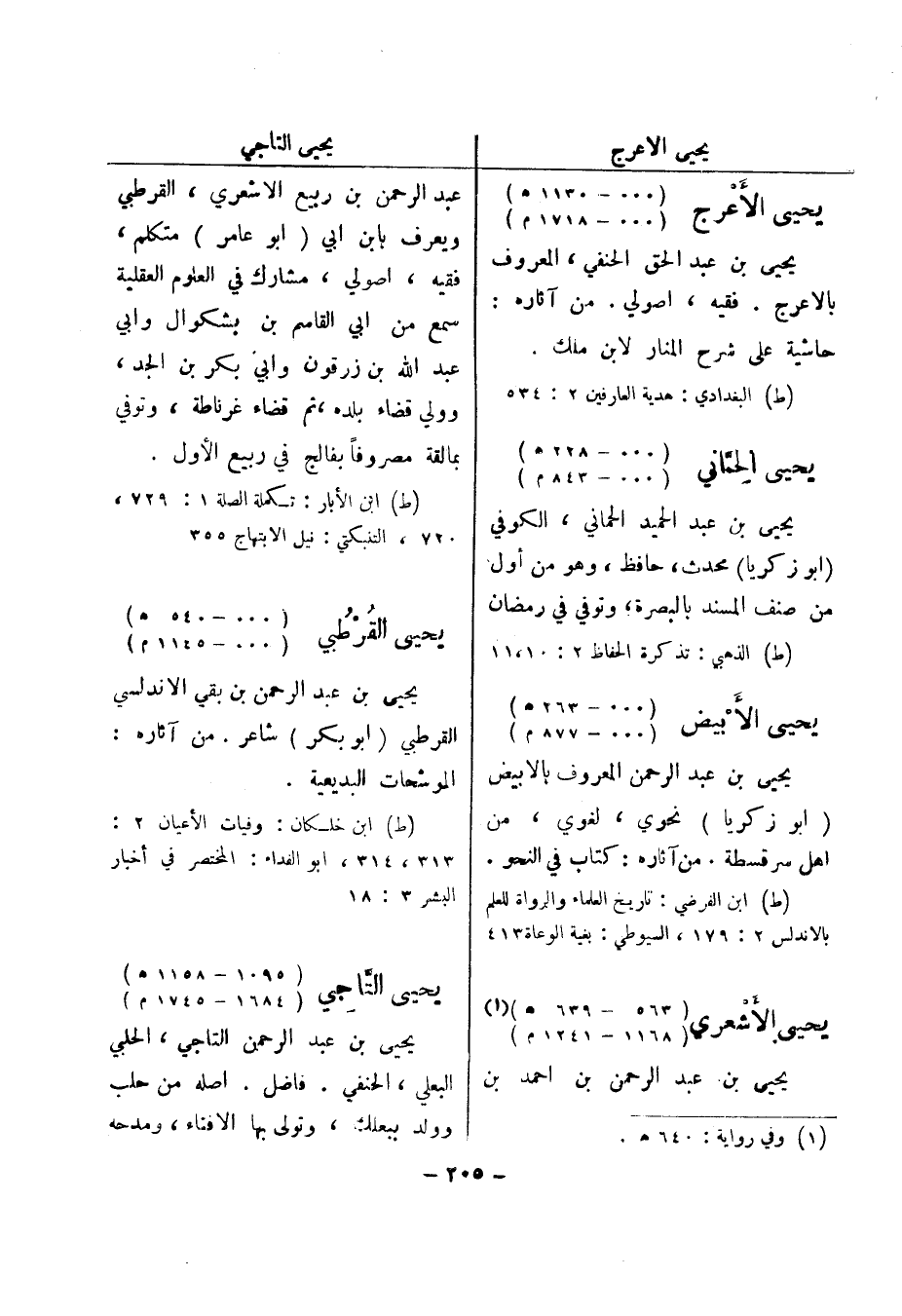 (ط) البغدادي: هدية العارفين 2: 534 يحيى الحماني (000 - 228 هـ) (000 - 843 م) يحيى بن عبد الحميد الحماني، الكوفي (أبو زكريا) محدث، حافظ، وهو من أول من صنف المسند بالبصرة، وتوفي في رمضان (ط) الذهبي: تذكرة الحفاظ 2: 10، 11 يحيى الابيض (000 - 263 هـ) (000 - 877 م) يحيى بن عبد الرحمن المعروف بالابيض (أبو زكريا) نحوي، لغوي، من اهل سرقسطة.