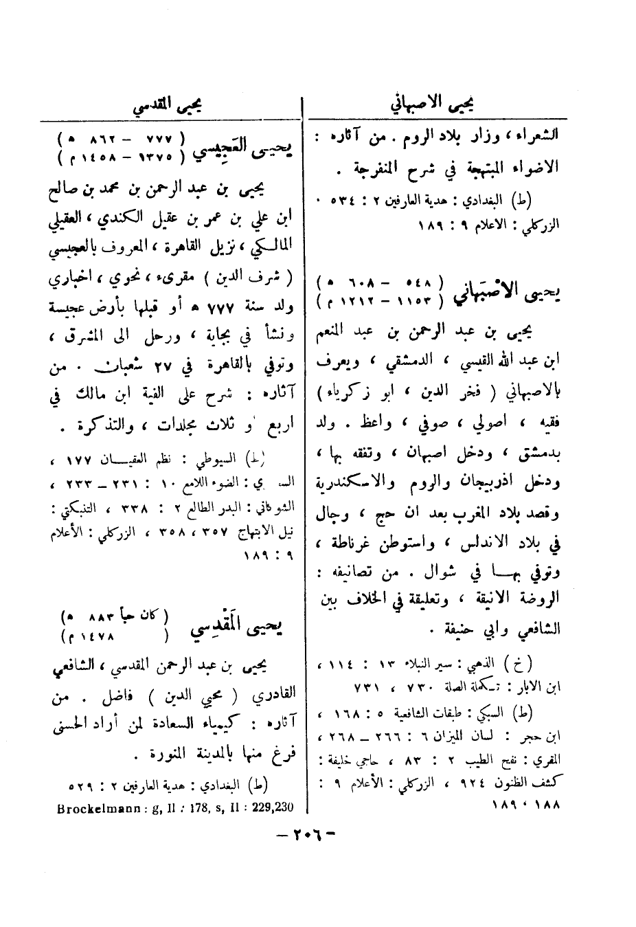 (ط) السيوطي: نظم العقيان 177، السورى: الضوء اللامع 10: 231 - 233، الشوكاني: البدر الطالع 2: 338، التنبكتي: نيل الابتهاج 357، 358، الزركلي: الاعلام 9: 189 يحيى المقدسي (كان حيا 883 هـ)