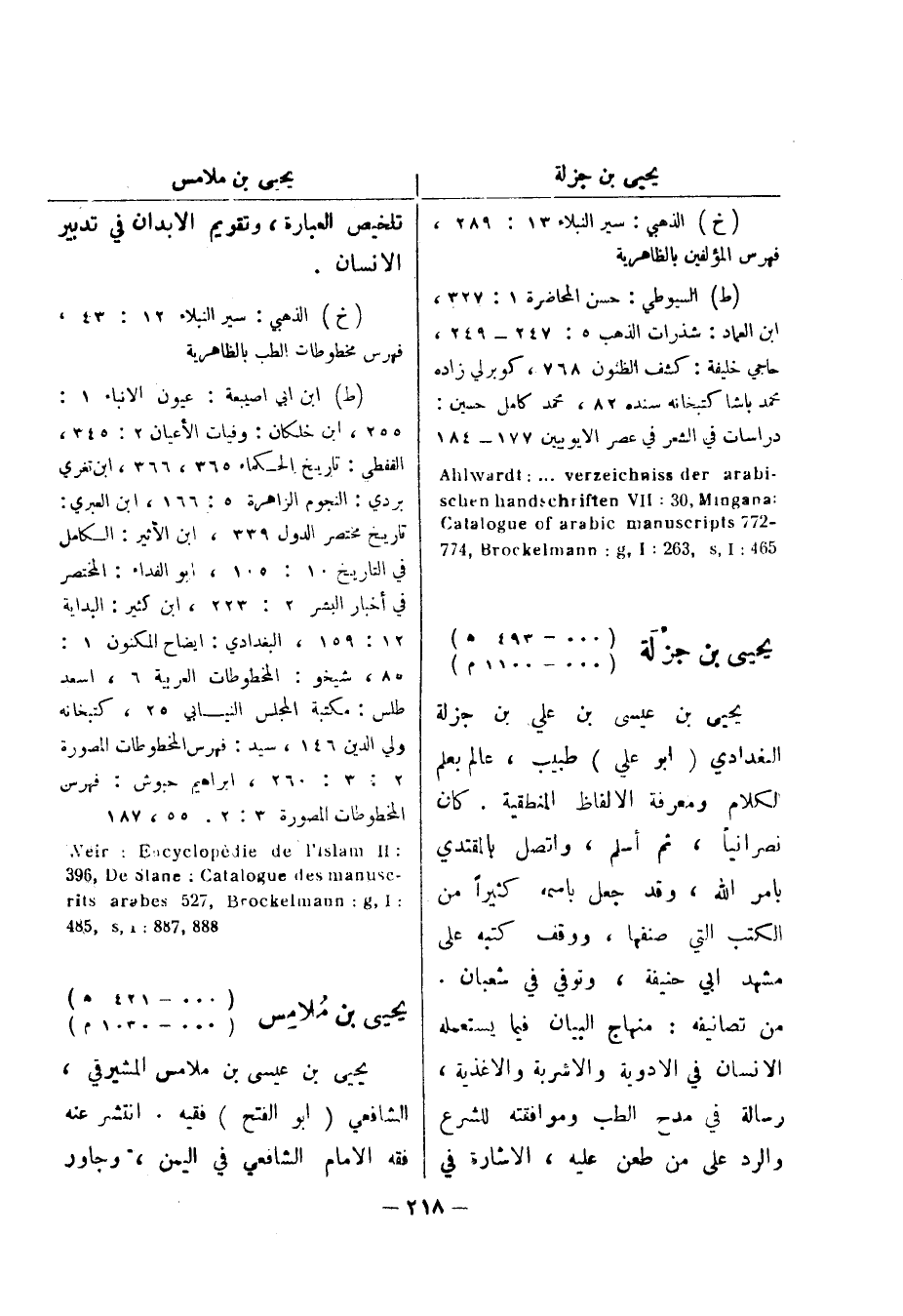 فهرس المؤلفين بالظاهرية (ط) السيوطي: حسن المحاضرة 1: 327، ابن العماد: شذرات الذهب 5: 247 - 249، حاجي خليفة: كشف الظنون 768، كوبرلي زاده محمد باشا كتبخانه سنده 82، محمد كامل حسين: دراسات في الشعر في عصر الايوبيين 177 - 184 - Ahlwardt: verzeichiss der arabi handschriften VII: 03 , Mingana - 772 catalogue of arabic manuscripts 465: Brockelmann: g , I: 362 , s , I يحيى بن جزلة (000 - 493 هـ) (000 - 1100 م) يحيى بن عيسى بن علي بن جزلة البغدادي (أبو علي) طبيب، عالم بعلم الكلام ومعرفة الالفاظ المنطقية.