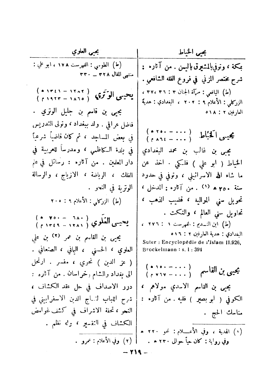 (ط) اليافعي: مرآة الجنان 3: 36، 37، الزركلي: الاعلام 9: 202، البغدادي: هدية العارفين 2: 518 يحيى الخياط (000 - 250 هـ) (000 - 864 م) يحيى بن غالب بن محمد البغدادي الخياط (أبو علي) فلكي.