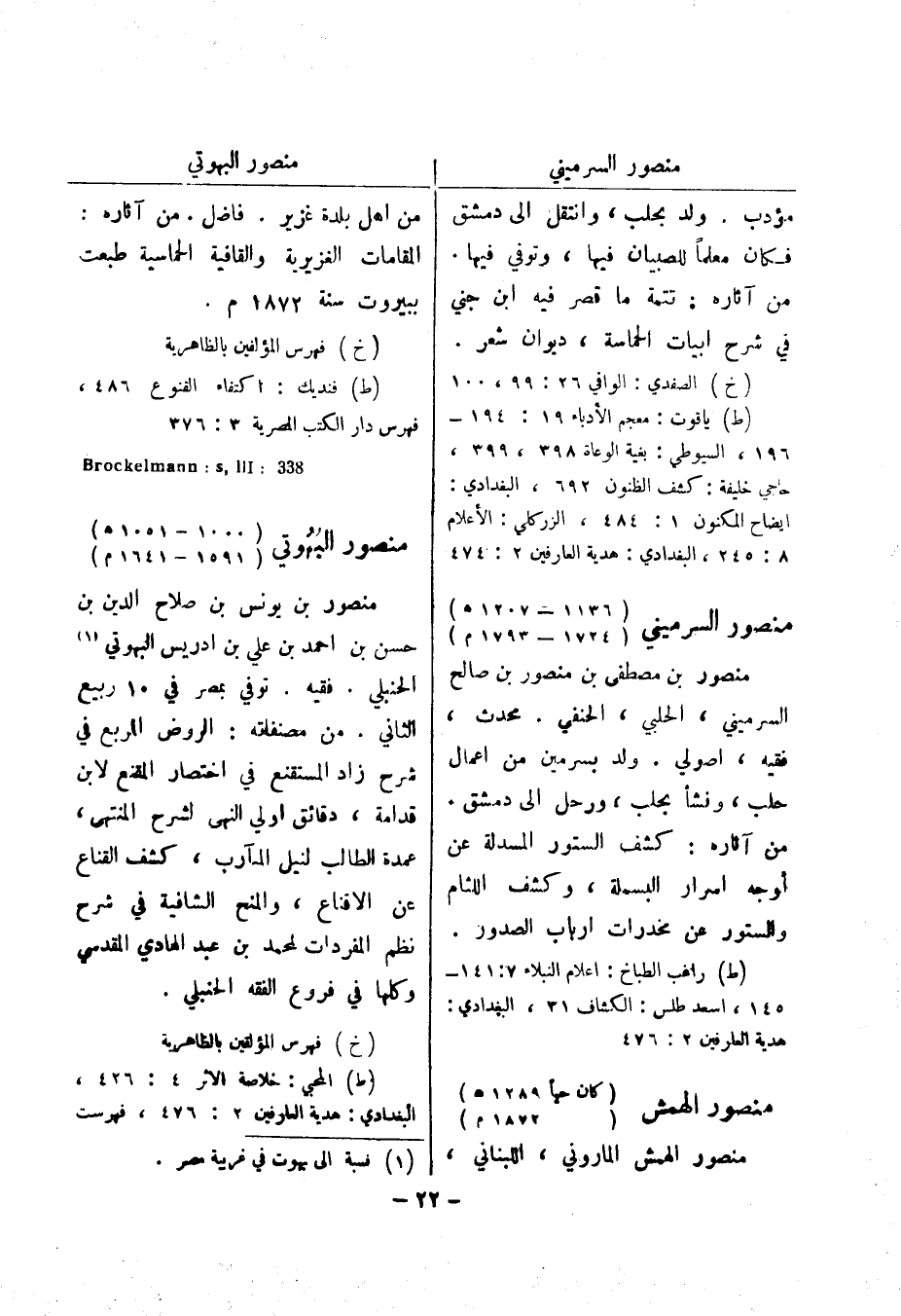 (خ) فهرس المؤلفين بالظاهرية (ط) فنديك: اكتفاء القنوع 486، فهرس دار الكتب المصرية 3: 376 338: lll، Brockelmann: s منصور البهوتي (1000 - 1051 هـ) (1591 - 1641 م) منصور بن يونس بن صلاح الدين بن حسن بن احمد بن علي بن ادريس البهوتي (1) الحنبلي.
