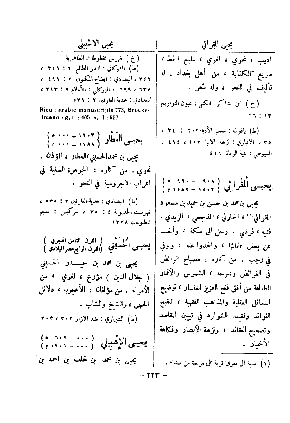 السيوطي: بغية الوعاة 416 يحيى المقرائي (908 - 990 هـ) (1502 - 1582 م) يحيى بن محمد بن حسن بن حميد بن مسعود المقرائي (1) ، الحارثي، المذجحي، الزيدي.