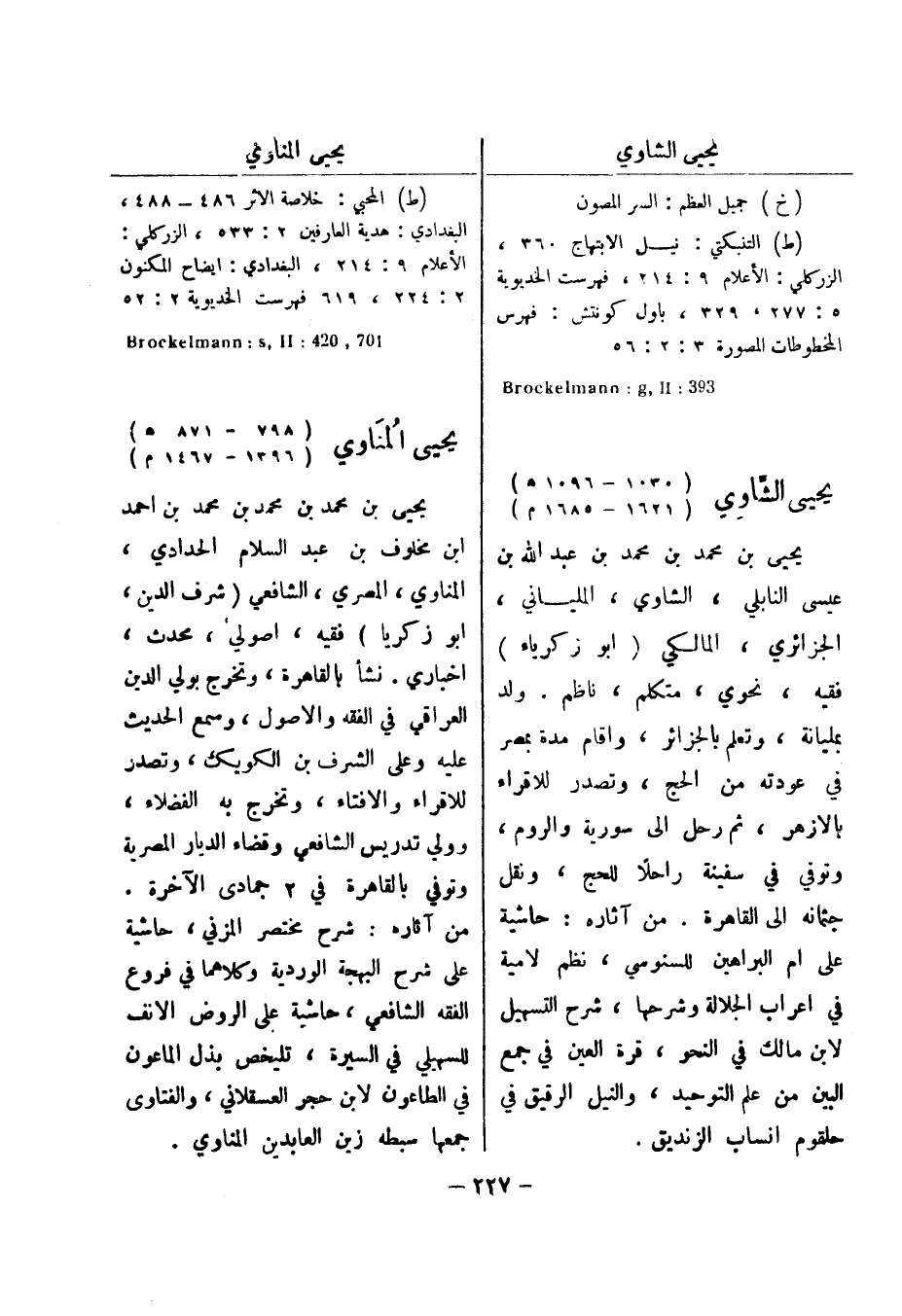 الاعلام 9: 214، البغدادي: ايضاح المكنون 2: 224، 619، فهرست الخديوية 2: 52 701 , 420: Brockelmann: s , II يحيى المناوي (798 - 871 هـ) (1396 - 1467 م) يحيى بن محمد بن محمد بن محمد بن احمد ابن مخلوف بن عبد السلام الحدادي، المناوي، المصري، الشافعي (شرف الدين، أبو زكريا) فقيه، اصولي، محدث، اخباري.