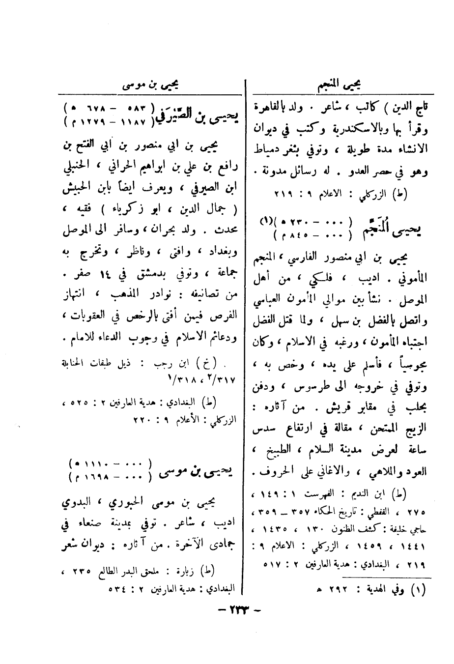 (ط) الزركلي: الاعلام 9: 219 يحيى المنجم (000 - 230 هـ) (1) (000 - 845 م)