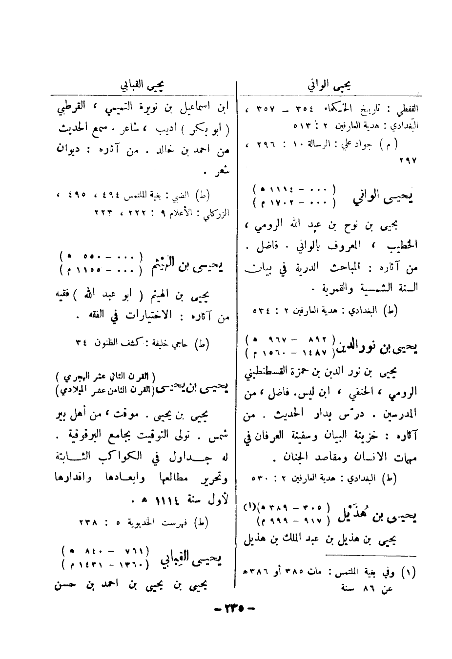 (ط) البغدادي: هدية العارفين 2: 534 يحيى بن نور الدين (892 - 967 هـ) (1487 - 1560 م) يحيى بن نور الدين بن حمزة القسطنطيني الرومي، الحنفي، ابن ليس.