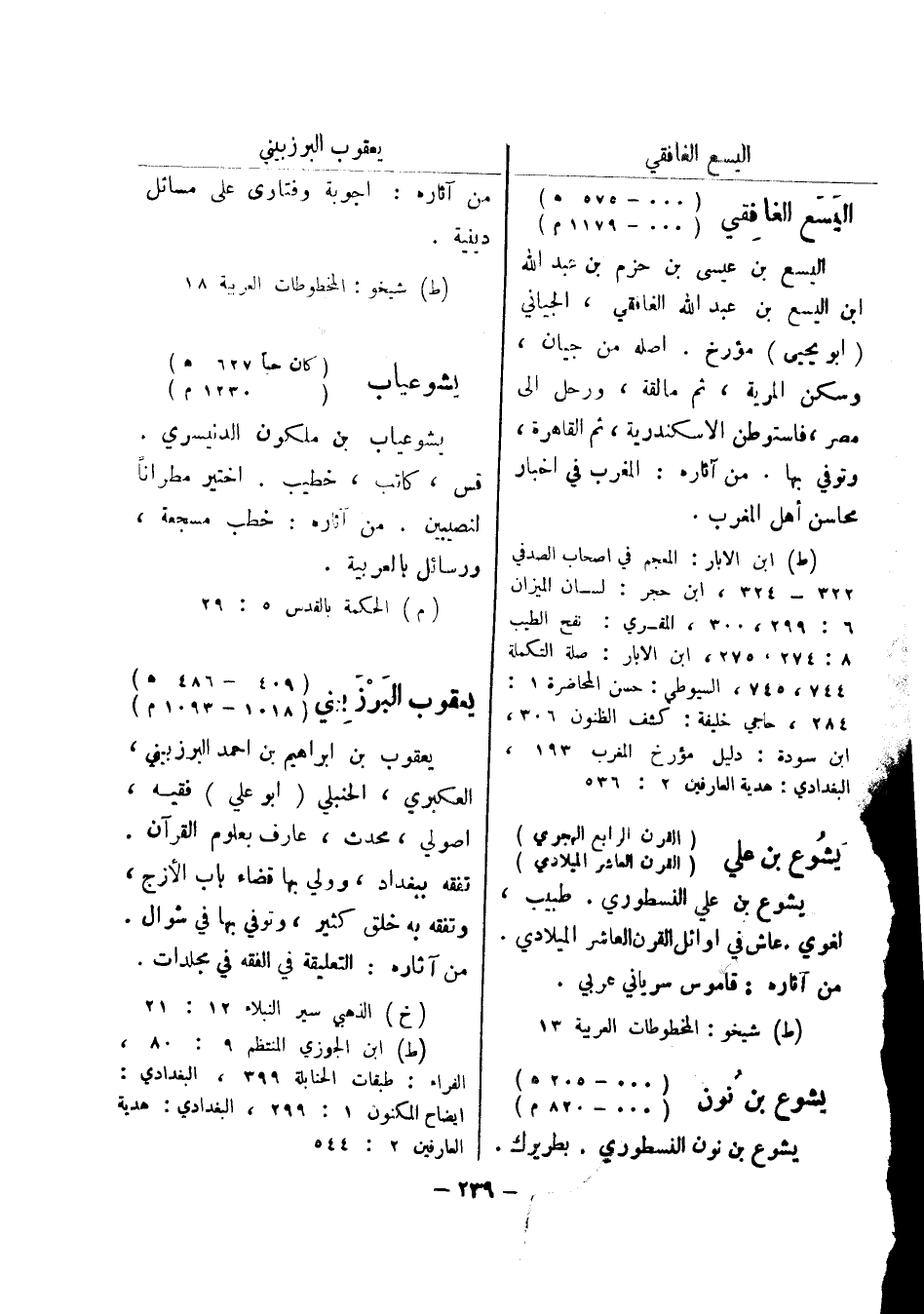 6: 299: 300، المقري: نفح الطيب 8: 274، 275، ابن الابار: صلة التكملة 744، 745، السيوطي: حسن المحاضرة 1: 284، حاجي خليفة: كشف الظنون 306، ابن سودة: دليل مؤرخ المغرب 193، البغدادي: هدية العارفين 2: 536 يشوع بن علي (القرن الرابع الهجري) (القرن العاشر الميلادي) يشوع بن علي النسطوري.
