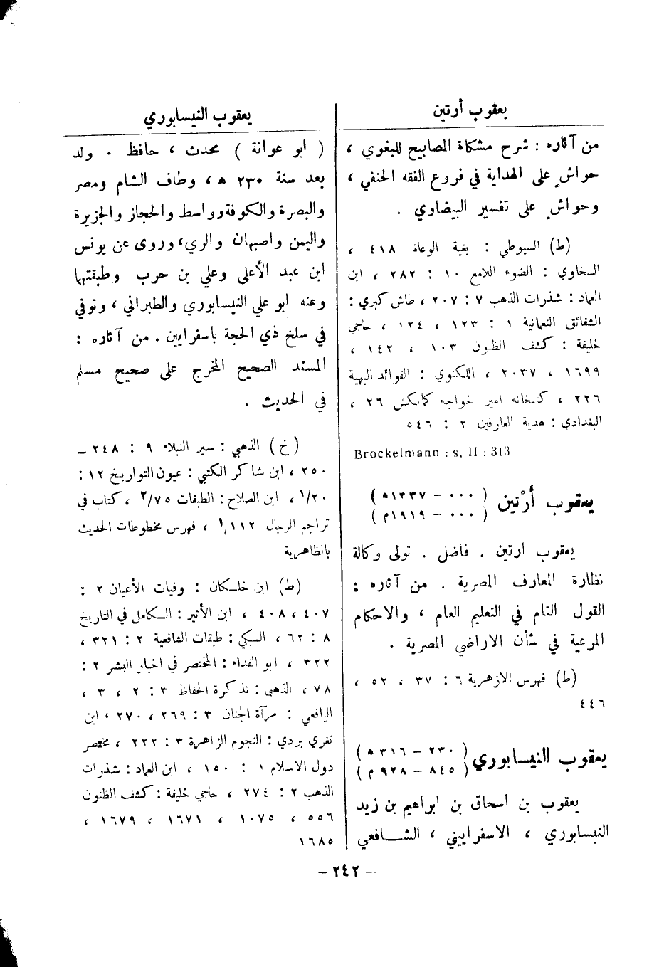 (ط) السيوطي: بغية الوعاة 418، السخاوي: الضوء اللامع 10: 282، ابن العماد: شذرات الذهب 7: 207، طاش كبري: الشقائق النعمانية 1: 123، 124، حاجي خليفة: كشف الظنون 103، 142، 1699، 2037، اللكنوي: الفوائد البهية 226، كتبخانه امير خواجه كمانكش 26، البغدادي: هدية العارفين 2: 546 313: Brockelmann: s , II يعقوب أرتين (000 - 1337 هـ) (000 - 1919 م) يعقوب ارتين.