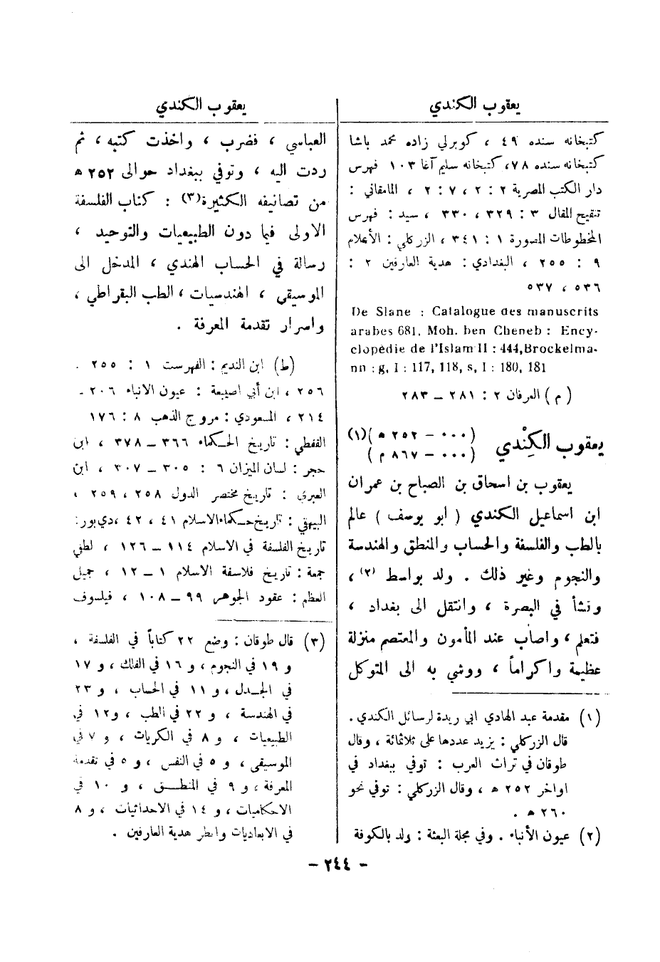 كتبخانه سنده 49، كوبرلي زاده محمد باشا كتبخانه سنده 78، كتبخانه سليم آغا 103 فهرس دار الكتب المصرية 2: 2، 7: 2، المامقاني: تنقيح المقال 3: 329، 330، سيد: فهرس المخطوطات المصورة 1: 341، الزركلي: الاعلام 9: 255، البغدادي: هدية العارفين 2: 536، 537،: arabes 186 , Moh , ben Cheneb De Slane: Catalogue des manuscrits 181 , 180: nn: g , I: 711 , 811 , s , I - clopedie de l ' Islam II: 444 , Brockelma - (Ency م) العرفان 2: 283 281 يعقوب الكندي (000 - 252 هـ) (1) (000 - 867 م) يعقوب بن اسحاق بن الصباح بن عمران ابن اسماعيل الكندي (أبو يوسف) عالم بالطب والفلسفة والحساب والمنطق والهندسة والنجوم وغير ذلك.