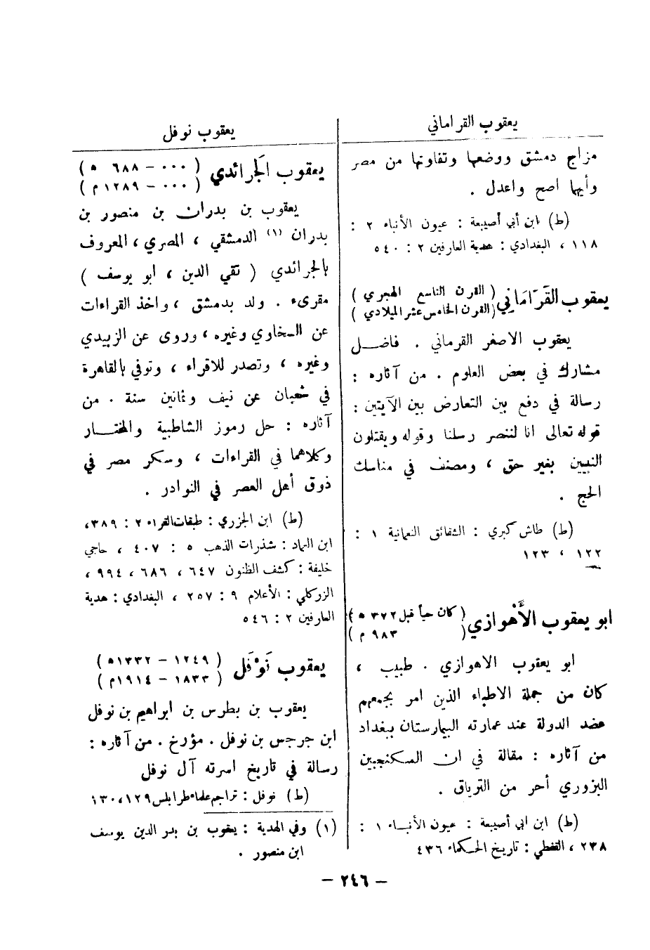 (ط) ابن الجزري: طبقات القراء 2: 389، ابن العماد: شذرات الذهب 5: 407، حاجي خليفة: كشف الظنون 647، 686، 994، الزركلي: الاعلام 9: 257، البغدادي: هدية العارفين 2: 546 يعقوب نوفل (1249 - 1332 هـ) (1833 - 1914 م) يعقوب بن بطرس بن ابراهيم بن نوفل ابن جرجس بن نوفل.