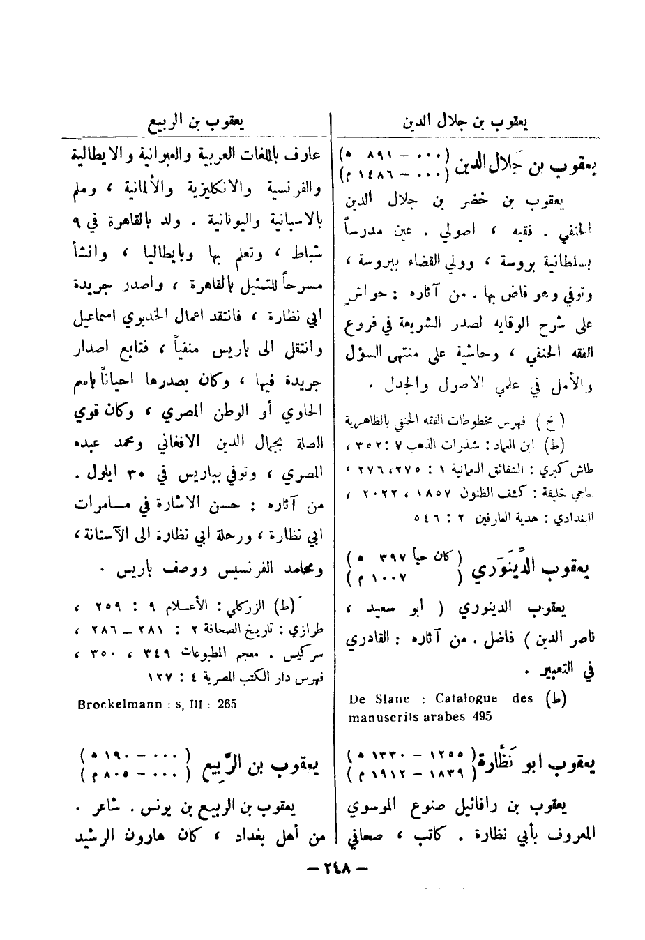 (ط) De Slane: Catalogue des 495 manuscrits arabes يعقوب أبو نظارة (1255 - 1330 هـ) (1839 - 1912 م) يعقوب بن رافائيل صنوع الموسوي المعروف بأبي نظارة.