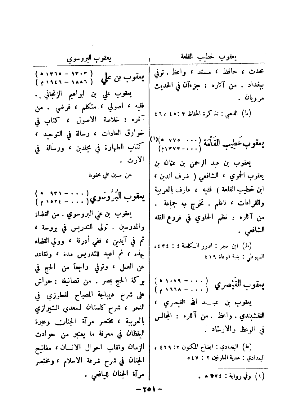 (ط) ابن حجر: الدرر الكامنة 4: 434، السيوطي: بغية الوعاة 419 يعقوب القيصري (000 - 1079 هـ) (000 - 1668 م) يعقوب بن عبد الله القيصري، النقشبندي.
