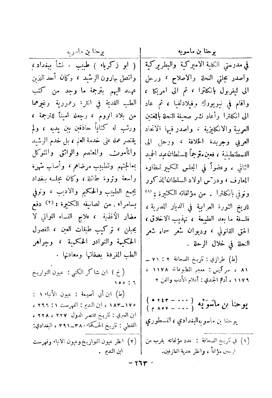 (ط) طرازي: تاريخ الصحافة 2: 71 - 81، سركيس: معجم المطبوعات 1178، 1179، أدهم الجندي: أعلام الادب والفن 2 يوحنا بن ماسويه (000 - 243 هـ) (000 - 857 م) يوحنا بن ماسويه البغدادي، النسطوري
