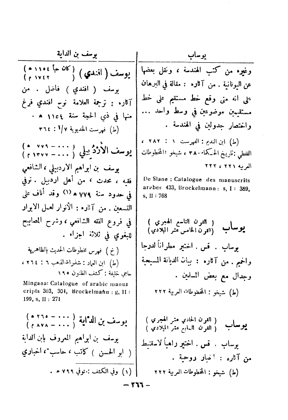 (ط) ابن النديم: الفهرست 1: 282، القفطي: تاريخ الحكماء 380، شيخو: المخطوطات العربية 221، 222 De Slan: Catalogue des manuscrits , 389: arabes 334 , Brockelmann: s , I 768: s , II يوساب (القرن التاسع الهجري) (القرن الخامس عشر الميلادي) يوساب.