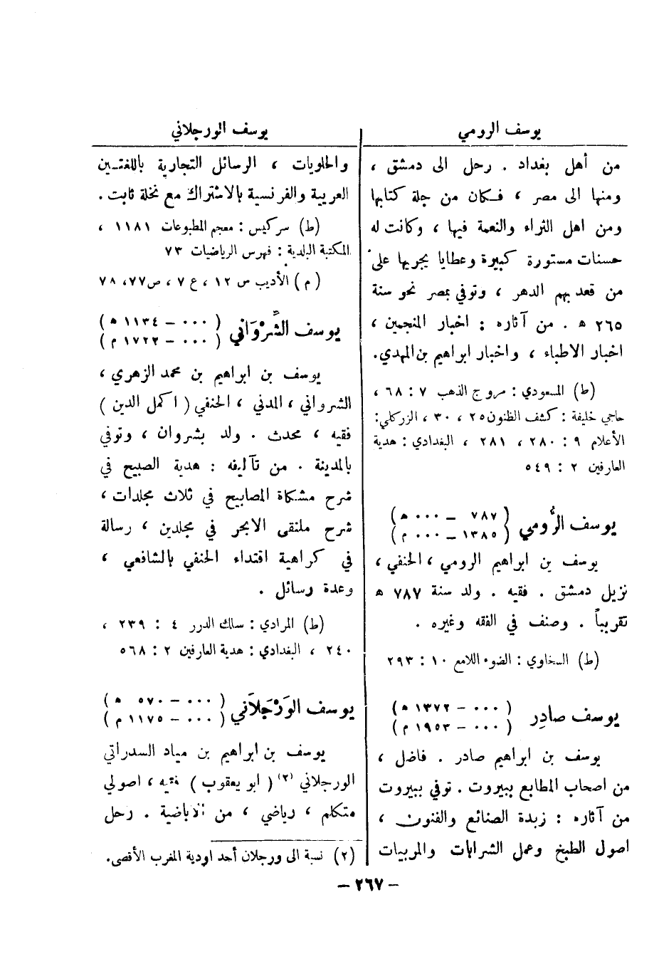 (ط) المرادي: سلك الدرر 4: 239، 240، البغدادي: هدية العارفين 2: 568 يوسف الورجلاني (000 - 570 هـ) (000 - 1175 م) يوسف بن ابراهيم بن مياد السدراتي الورجلاني (2) (أبو يعقوب) فقيه، اصولي متكلم، رياضي، من الاباضية.