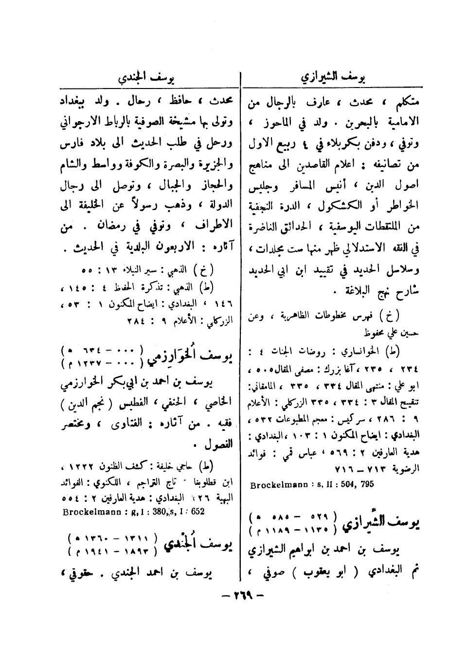 (خ) فهرس مخطوطات الظاهرية، وعن حسين علي محفوظ (ط) الخوانساري: روضات الجنات 4: 234، 235، آغا بزرك: مصفى المقال 505، ابو علي: منتهى المقال 334، 335، المامقاني: تنقيح المقال 3: 334، 335 الزركلي: الاعلام 9: 286، سركيس: معجم المطبوعات 532، البغدادي: ايضاح المكنون 1: 103، البغدادي: هدية العارفين 2: 569، عباس قمي: فوائد الرضوية 713 - 716 795 , 504: Brockelmann: s , II يوسف الشيرازي (529 - 585 هـ) (1135 - 1189 م) يوسف بن احمد بن ابراهيم الشيرازي ثم البغدادي (أبو يعقوب) صوفي، محدث، حافظ، رحال.