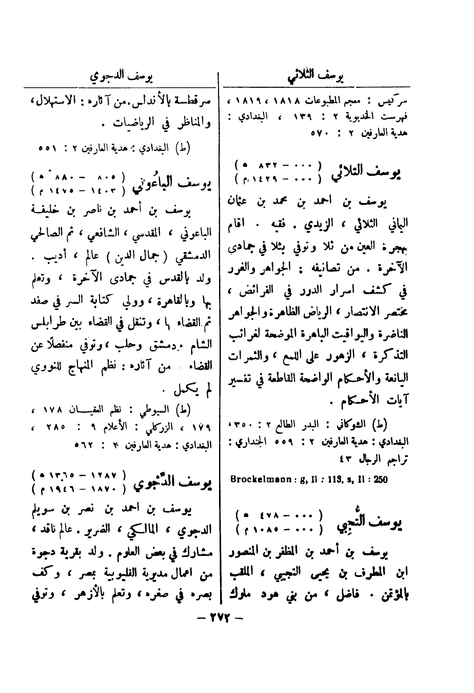 (ط) البغدادي: هدية العارفين 2: 551 يوسف الباعوني (805 - 880 هـ) (1403 - 1475 م) يوسف بن أحمد بن ناصر بن خليفة الباعوني، المقدسي، الشافعي، ثم الصالحي الدمشقي (جمال الدين) عالم، أديب.
