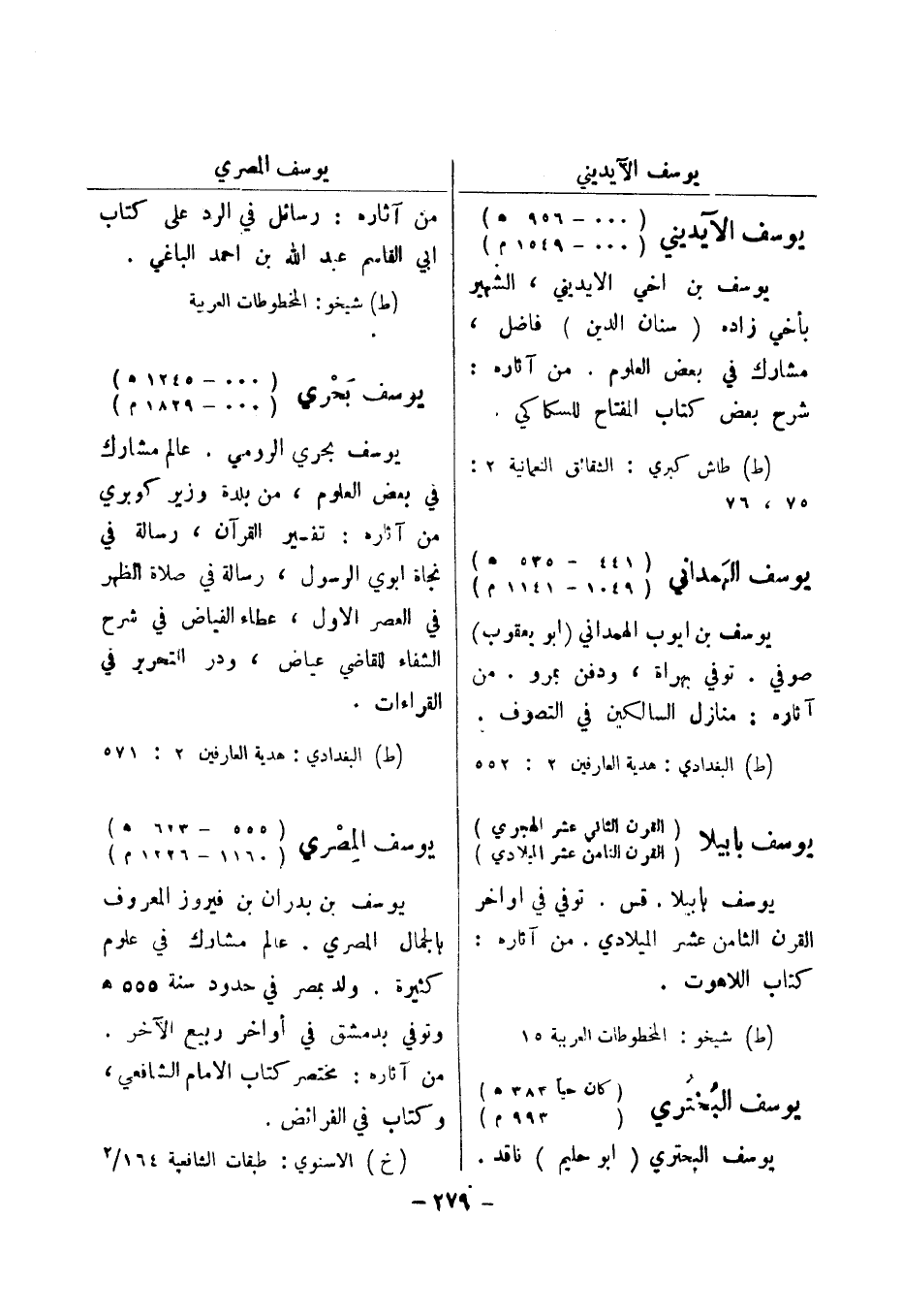(ط) البغدادي: هدية العارفين 2: 571 يوسف المصري (555 - 623 هـ) (1160 - 1226 م) يوسف بن بدران بن فيروز المعروف بالجمال المصري.