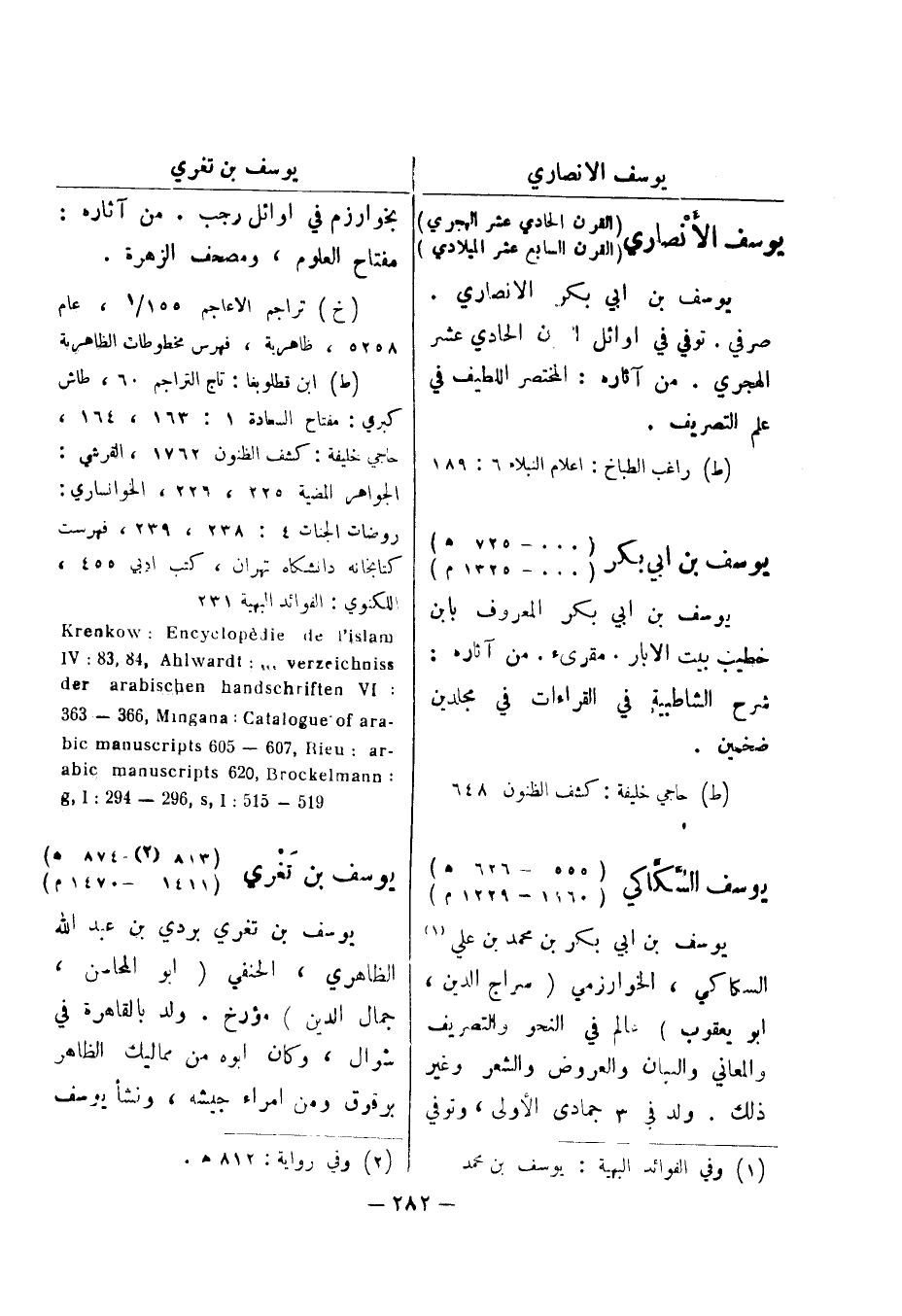 (خ) تراجم الاعاجم 155 / 1، عام 5258، ظاهرية، فهرس مخطوطات الظاهرية (ط) ابن قطلوبغا: تاج التراجم 60، طاش كبري: مفتاح السعادة 1: 163، 164، حاجي خليفة: كشف الظنون 1762، القرشي: الجواهر المضية 225، 226، الخوانساري: روضات الجنات 4: 238، 239، فهرست كتابخانه دانشكاه تهران، كتب ادبي 455، اللكنوي: الفوائد البهية 231 der IV: 38 , 48 , Ahlwardt: ... verzeichniss Krenkow: Encyclopedie de l ' islam bic - 363 - 663 , Mingana: Catalogue of ara: g , I: 692 , s , I: arabischen handschriften VI: abic manuscripts 026 , Brockelmann - 515 - manuscript s 506 915 - 706 , Rieu: ar يوسف بن تغري (813 (2) - 874 هـ) (1411 - 1470 م) يوسف بن تغري بردي بن عبد الله الظاهري، الحنفي (أبو المحاسن، جمال الدين) مؤرخ.