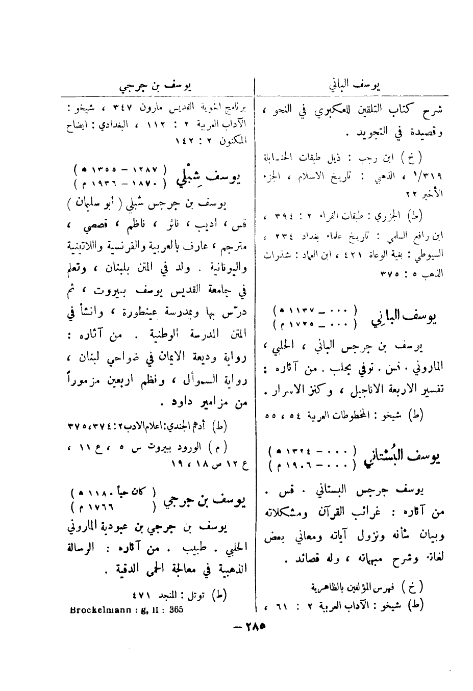 السيوطي: بغية الوعاة 421، ابن العماد: شذرات الذهب 5: 375 يوسف الباني (000 - 1137 هـ) (000 - 1725 م) يوسف بن جرجس الباني، الحلبي، الماروني.
