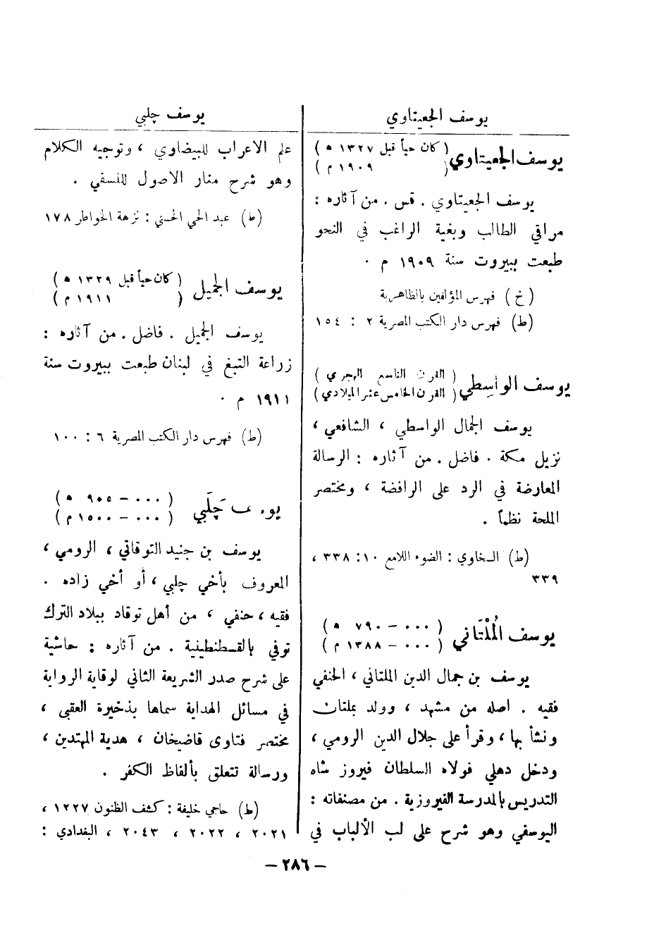 (ط) عبد الحي الحسني: نزهة الخواطر 178 يوسف الجميل (كان حيا قبل 1329 هـ) (1911 م) يوسف الجميل.