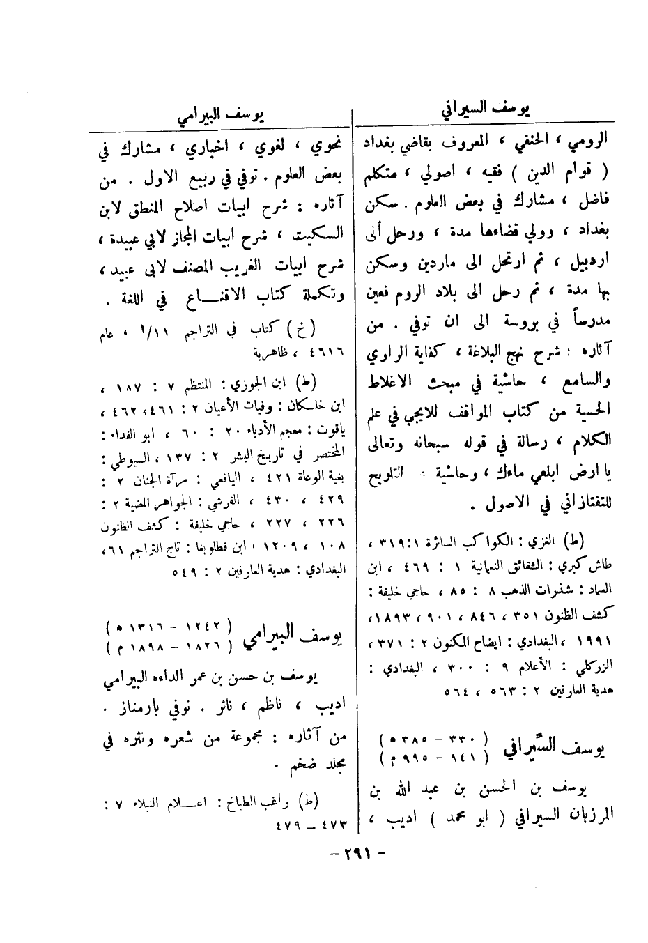 (خ) كتاب في التراجم 11 / 1، عام 4616، ظاهرية (ط) ابن الجوزي: المنتظم 7: 187، ابن خلكان: وفيات الاعيان 2: 461، 462، ياقوت: معجم الادباء 20: 60، أبو الفداء: المختصر في تاريخ البشر 2: 137، السيوطي: بغية الوعاة 421، اليافعي: مرآة الجنان 2: 429، 430، القرشي: الجواهر المضية 2: 226، 227، حاجي خليفة: كشف الظنون 108، 1209، ابن قطلوبغا: تاج التراجم 61، البغدادي: هدية العارفين 2: 549 يوسف البيرامي (1242 - 1316 هـ) (1826 - 1898 م) يوسف بن حسن بن عمر الداءه البيرامي اديب، ناظم، ناثر.