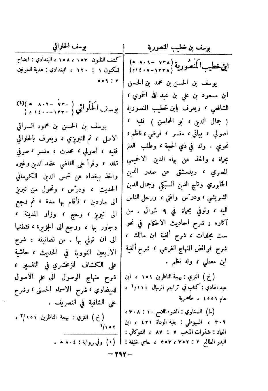 (خ) الغزي: بهجة الناظرين 151، ابن عبد الهادي: كتاب في تراجم الرجال 114 / 1، عام 4551، ظاهرية (ط) السخاوي: الضوء اللامع 10: 308، 309، السيوطي: بغية الوعاة 421، ابن العماد: شذرات الذهب 7: 87، الشوكاني: البدر الطالع 2: 352، 353، حاجي خليفة: كشف الظنون 153، 158، البغدادي: ايضاح المكنون 1: 120، البغدادي: هدية العارفين 2: 559 يوسف الحلوائي (730 - 802 هـ) (1) (1330 - 1400 م) يوسف بن الحسن بن محمود السرائي الاصل، ثم التبريزي، ويعرف بالحلوائي فقيه، اصولي، محدث، مفسر، صرفي تفقه، وقرأ على القاضي عضد الدين وغيره واخذ ببغداد عن شمس الدين الكرماني الحديث، ودرس، وتحول من تبريز إلى ماردين، فأقام بها مدة، ثم رجع إلى تبريز، وحج، وزار المدينة، وجاور بها، ورجع إلى الجزيرة، فقطنها إلى ان توفي بها.