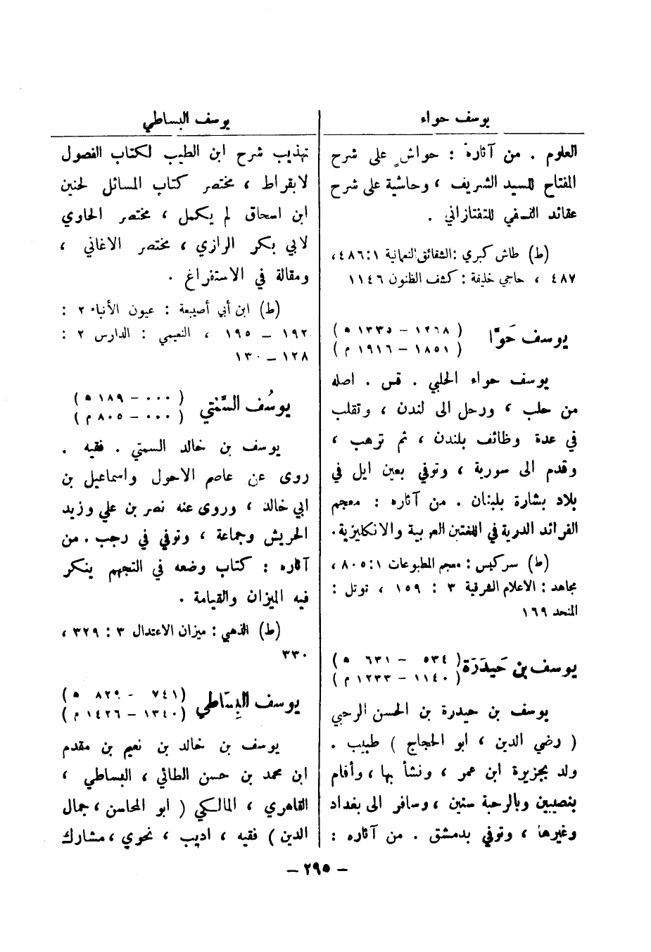 (ط) طاش كبري: الشقائق النعمانية 1: 486، 487، حاجي خليفة: كشف الظنون 1146 يوسف حوا (1268 - 1335 هـ) (1851 - 1916 م) يوسف حواء الحلبي.