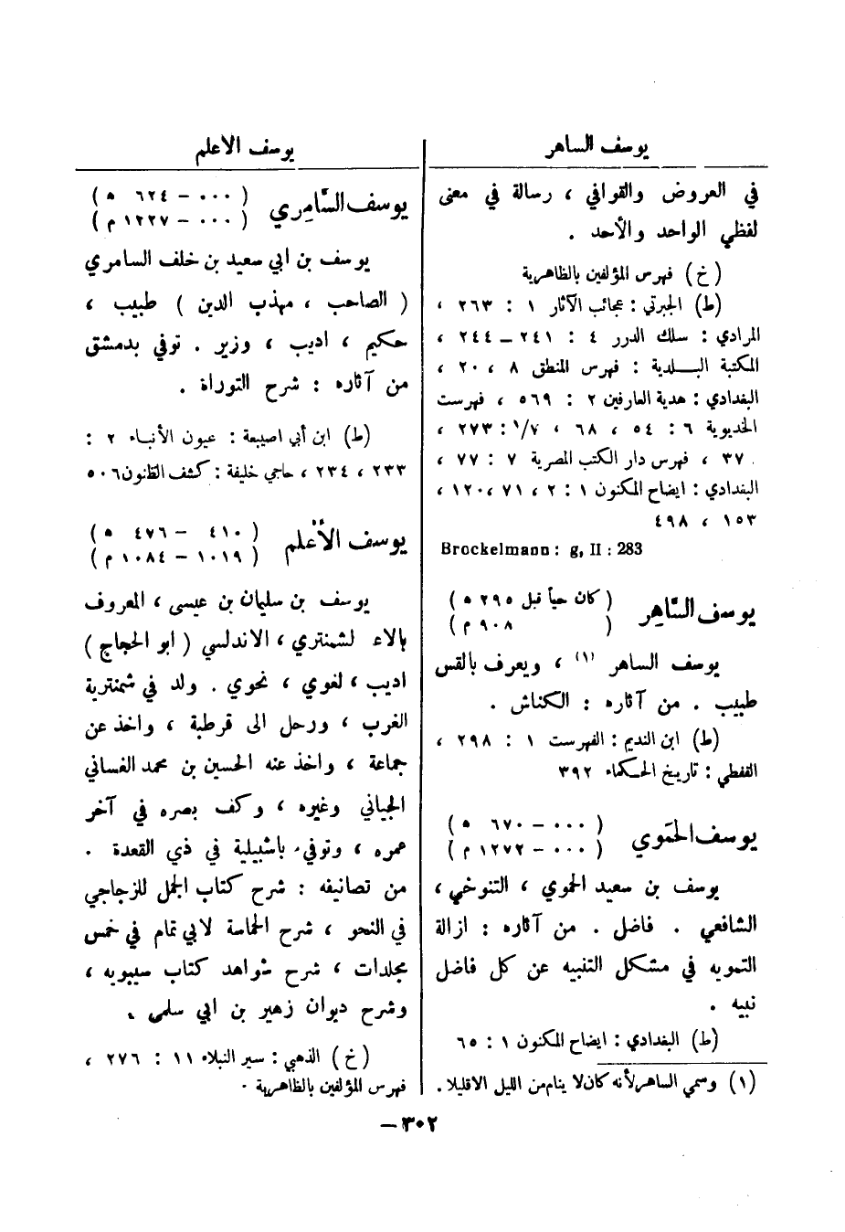 (خ) فهرس المؤلفين بالظاهرية (ط) الجبرتي: عجائب الآثار 1: 263، المرادي: سلك الدرر 4: 241 - 244، المكتبة البلدية: فهرس المنطق 8، 20، البغدادي: هدية العارفين 2: 569، فهرست الخديوية 6: 68 54، 7 / 1: 273، 37، فهرس دار الكتب المصرية 7: 77، البغدادي: ايضاح المكنون 1: 2، 71، 120، 153، 498 283: Brockelmann: g , II يوسف الساهر (كان حيا قبل 295 هـ) (908 م) يوسف الساهر (1) ، ويعرف بالقس طبيب.