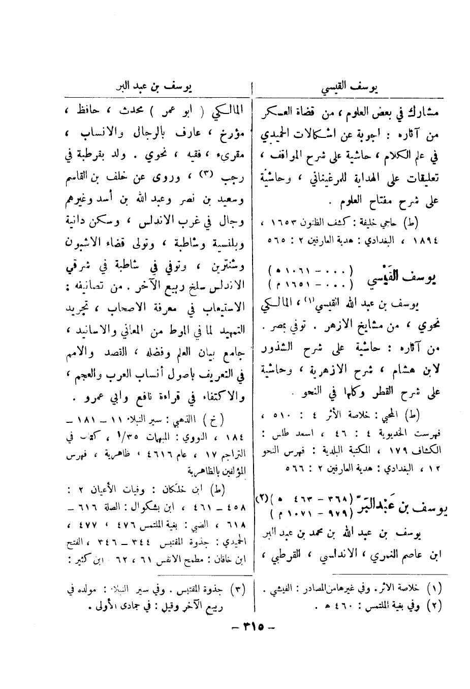 (ط) المحبي: خلاصة الاثر 4: 510، فهرست الخديوية 4: 46، اسعد طلس: الكشاف 179، المكتبة البلدية: فهرس النحو 12، البغدادي: هدية العارفين 2: 566 يوسف بن عبد البر (368 - 463 هـ) (2) (979 - 1071 م) يوسف بن عبد الله بن محمد بن عبد البر ابن عاصم النمري، الاندلسي، القرطبي،