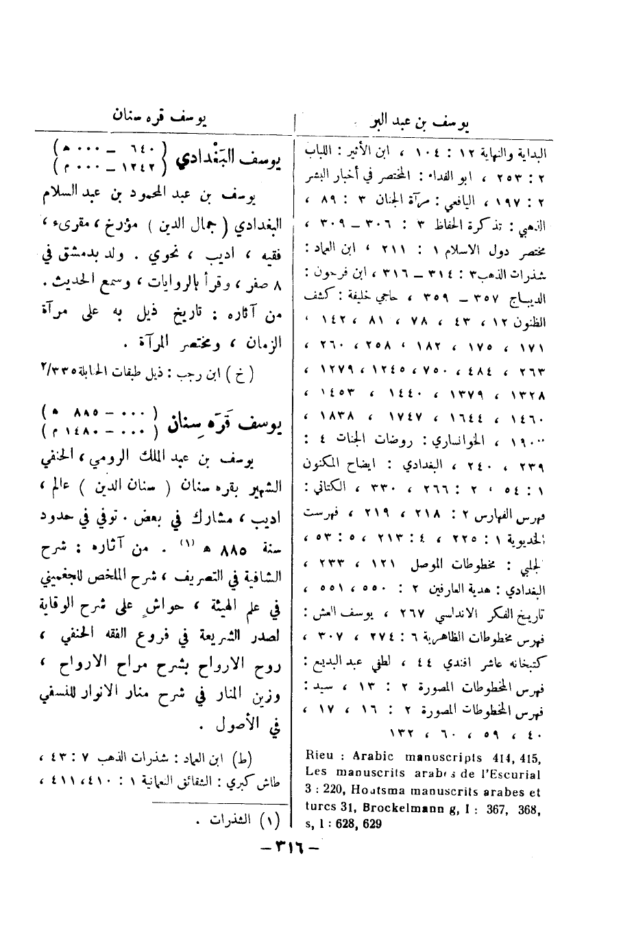 الجلبي: مخطوطات الموصل 121، 233، البغدادي: هدية العارفين 2: 550، 551، تاريخ الفكر الاندلسي 267، يوسف العش: فهرس مخطوطات الظاهرية 6: 274، 307، كتبخانة عاشر افندي 44، لطفي عبد البديع: فهرس المخطوطات المصورة 2: 13، سيد: فهرس المخطوطات المصورة 2: 16، 17، 40، 59، 60، 132 415 , 414 Rieu: Arabic manuscripts Les manuscrits arabes de I , Escurial 3: 022 , Hoatsma manuscrits arabes et 368 , 367: turcs 13 , Brockelmann g , I 629 , 628: s , l يوسف البغدادي (640 - 000 هـ) (1242 - 000 م) يوسف بن عبد المحمود بن عبد السلام البغدادي (جمال الدين) مؤرخ، مقرئ، فقيه، اديب، نحوي.